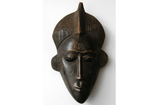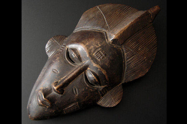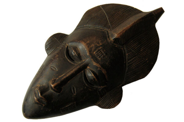 Dit Baule masker / gezichtsmasker is gemaakt in Ivoorkust West Afrika door het Akan volk (Baule stam). Het houten masker / gezichtsmasker stamt uit omstreeks 1920 weegt 700 gram en is 35.2 cm lang bij 19.5 cm breed bij 8 cm hoog.
