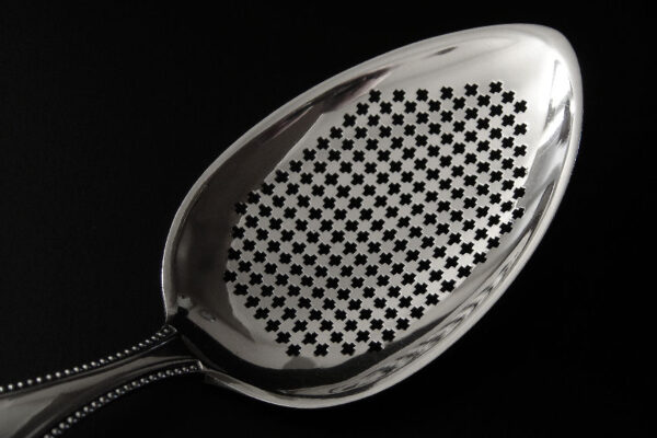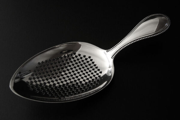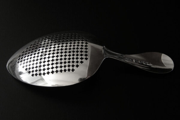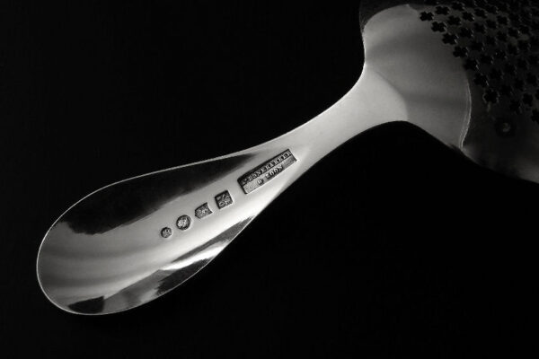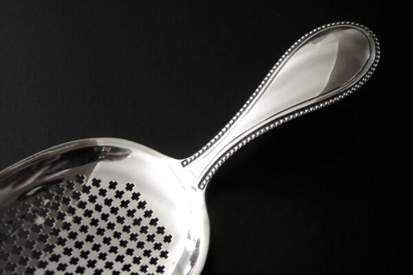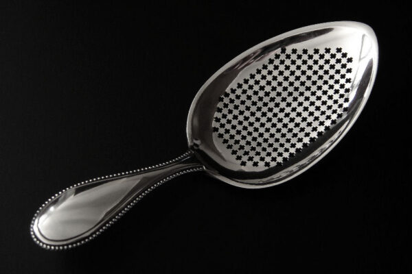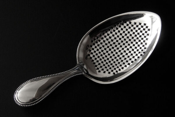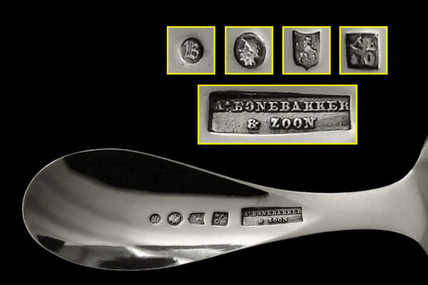 Deze natfruitschep is gemaakt in Amsterdam door Jan Hendrik Eversbag & Daniël van Outvorst (meesterteken anker E boven & O in vierkant) in het jaar 1886 (jaarletter B). Tevens heeft de natfruitschep het winkeliersmerk van A. Bonebakker & Zoon deze firma is sinds 1792 bekend vanwege de verkoop van zilveren voorwerpen van zéér hoge kwaliteit. De eerste gehalte zilveren in Jugendstil uitgevoerde natfruitschep heeft een steel met parelrand en een met plusjes uitgezaagd schepgedeelte. De natfruitschep weegt 60 gram is 17.1 cm lang. De in ovaalpunt gevormde schep is 10 cm lang bij 6.5 cm breed.