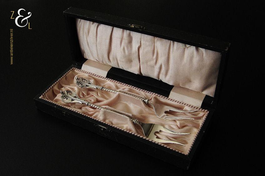 Dit stel confiturevorken is gemaakt in Den Bosch / ‘s-Hertogenbosch door Johannes Wilhelmus (Willem) Kalberg (meesterteken WK1 in langwerpige zeshoek) in het jaar 1870 (jaarletter L). Het zilveren in Neostijl uitgevoerde stel confiturevorken dat 24 gram weegt is 12.9 cm lang en heeft sierlijk uitgezaagde handvatten die gegraveerd zijn met c-vormige voluten.