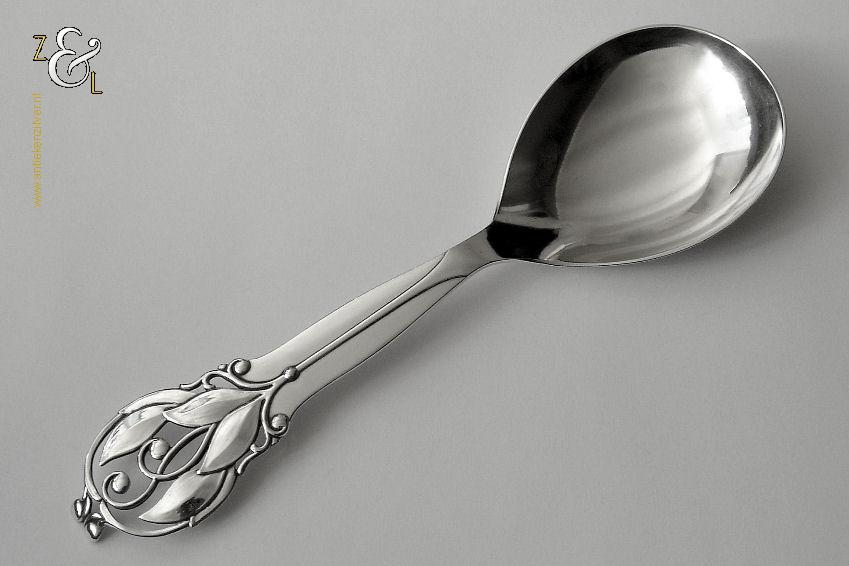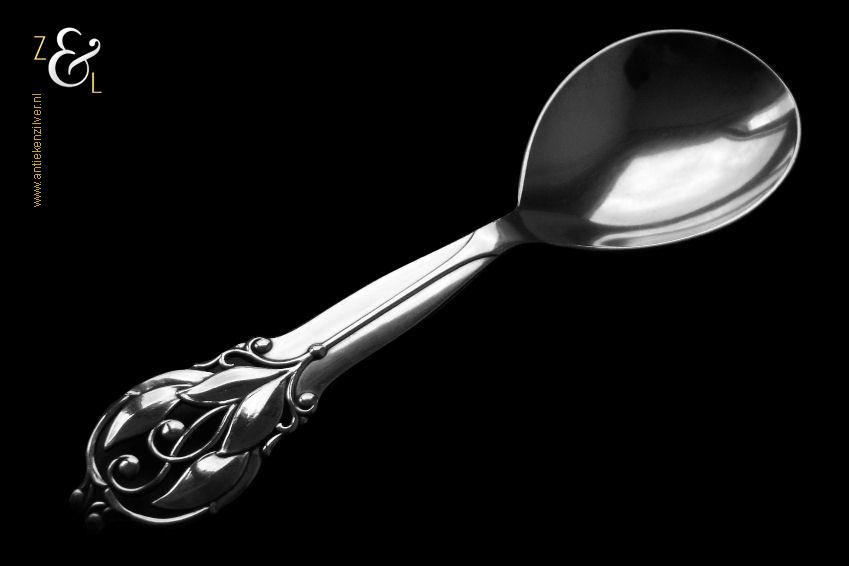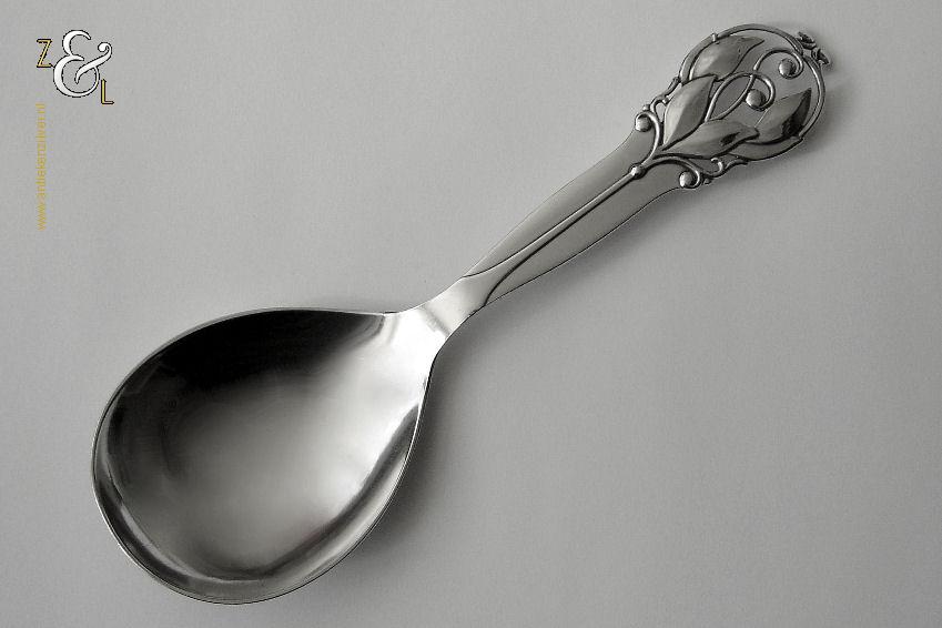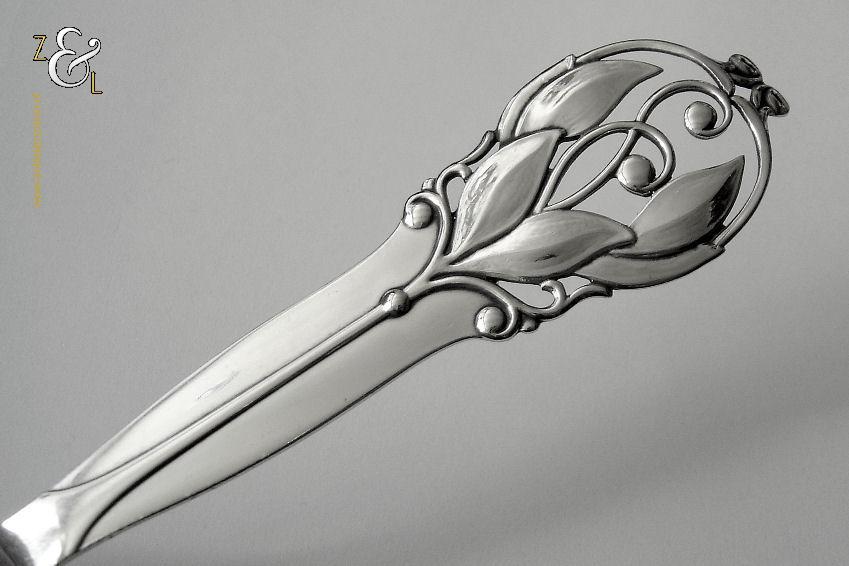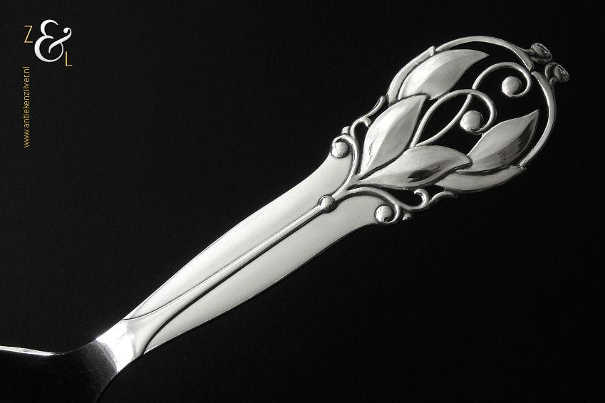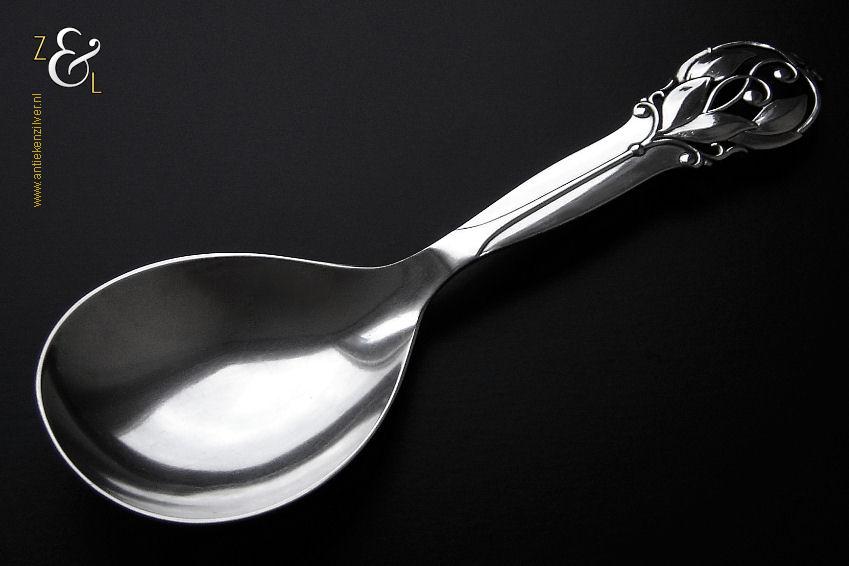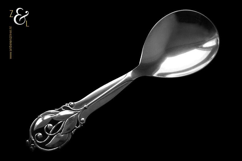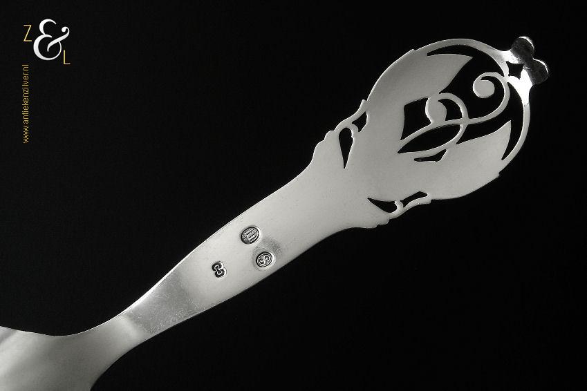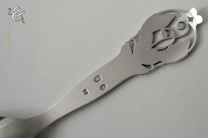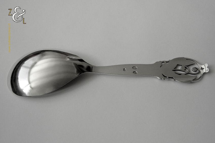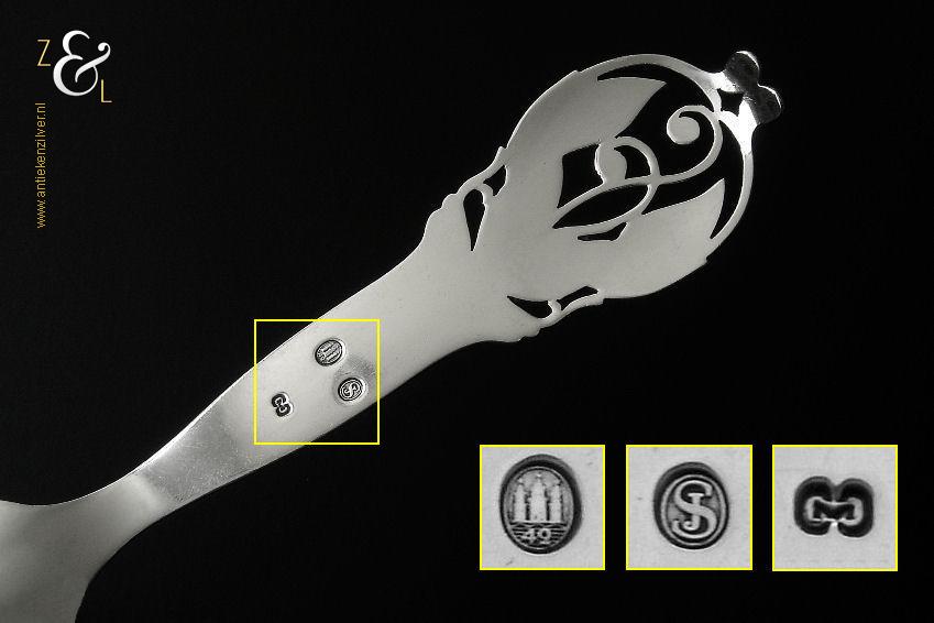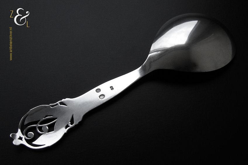 Deze rijstlepel is gemaakt door Carl M. Cohr te Fredericia Denemarken (meesterteken CM en een gespiegelde C). Tevens is de rijstlepel gestempeld met het essayeursmerk JS in ovaal dat staat voor essayeur Jens Sigsgaard werkzaam van 1932 tot 1960 en het zilverkeur drie torens met daaronder het getal 49 duidend op het jaartal 1949 dit is het jaar waarin de rijstlepel gemaakt is. De zilveren in Art Nouveau stijl uitgevoerde rijstlepel heeft aan het uiteinde van de steel een uitgezaagd motief. De rijstlepel weegt 75 gram en is 21.8 cm lang. De lepelbak is 8.5 cm lang bij 6.6 cm breed. De rijstlepel heeft gebruikssporen (de lepelbak heeft een héél lichte egale matte patina).