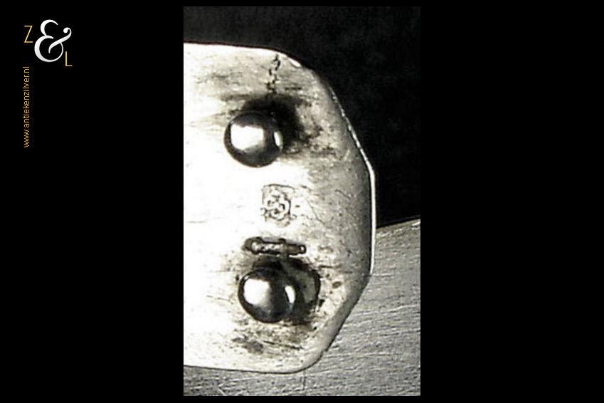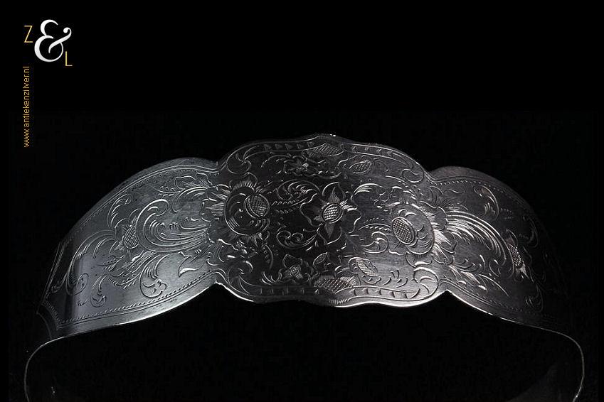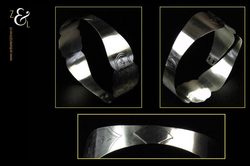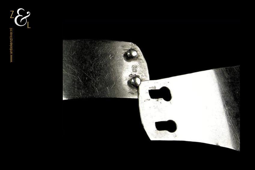 Deze armband voor een kluwenspeld* is gemaakt in Utrecht / Maarssen door Willem Snijders (meesterteken WS boven klaver in vierkant) tussen de jaren 1830 en 1838 (gekeurd met het zilverkeur zwaardje). De zilveren Biedermeier armband waarvan zowel de voor- als achterzijde met c-vormige voluten en bloemmotieven gegraveerd is weegt 24 gram heeft een diameter van 10 cm en is 3.3 cm breed. Deze armband voor een kluwenspeld is een bijzonder stukje naaigerei dat nog maar weinig voorkomt. De armband heeft een klein scheurtje (zie rode kader op de afbeelding).
