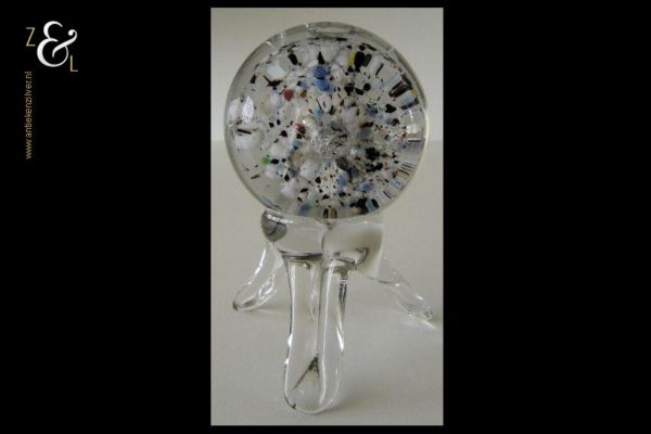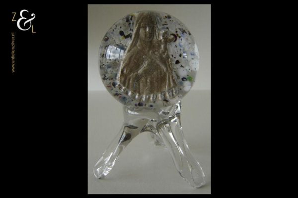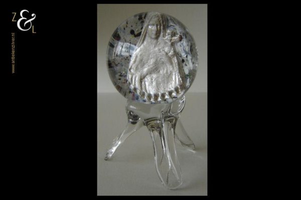 Deze presse papier met drie glazen poten is gemaakt in België bij de glasblazerij Val Saint Lambert en stamt uit de 19e eeuw. De presse papier heeft een religieuze voorstelling gemaakt van zilver- of aluminiumfolie dat opgesloten zit in het glas. Aan de achter- en bovenkant van deze presse papier zit een pontil merk* en de achtergrond is gedecoreerd met een veelkleurig stippen / confettipatroon. De presse papier heeft een hoogte van 13.8 cm, de glazen bol heeft een diameter van 8.2 cm en hij weegt 772 gram.