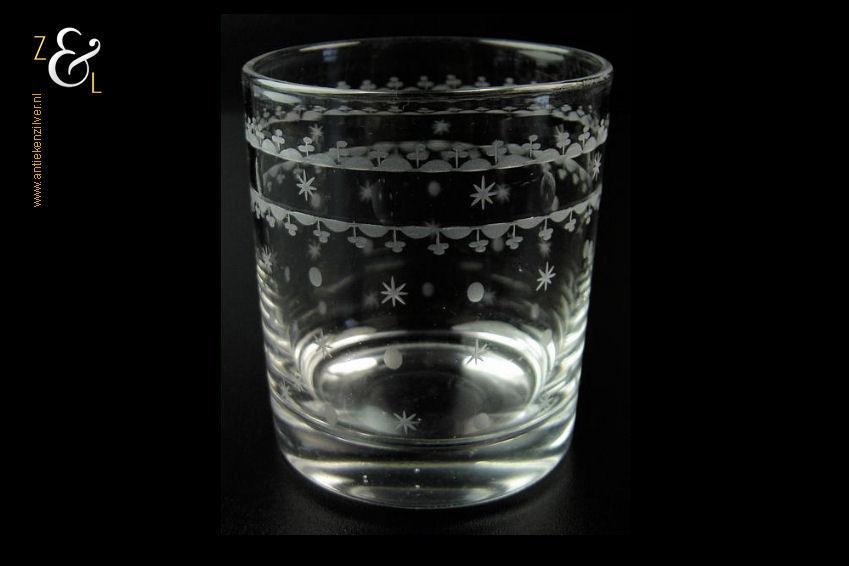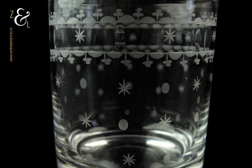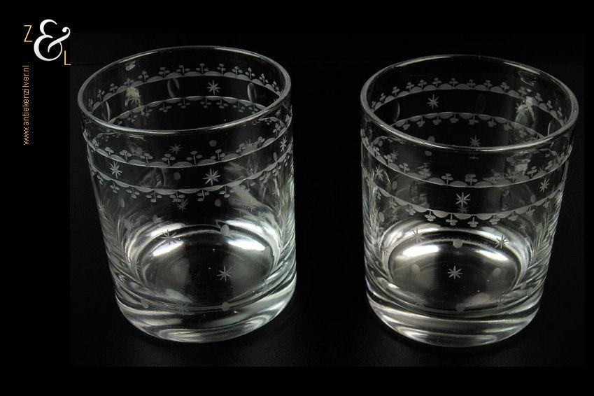 Dit stel Art Nouveau whiskey- whiskyglazen is gemaakt in de 19e eeuw door de kristal- en glasfabriek Vonêche in de Provincie Namen te België. De mondgeblazen en met sterren en stippen geëtste en geslepen glazen wegen samen 475 gram zijn 8.5 cm hoog en hebben een diameter van 7.2 cm.