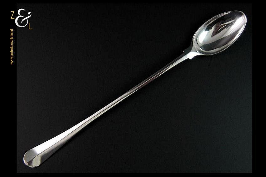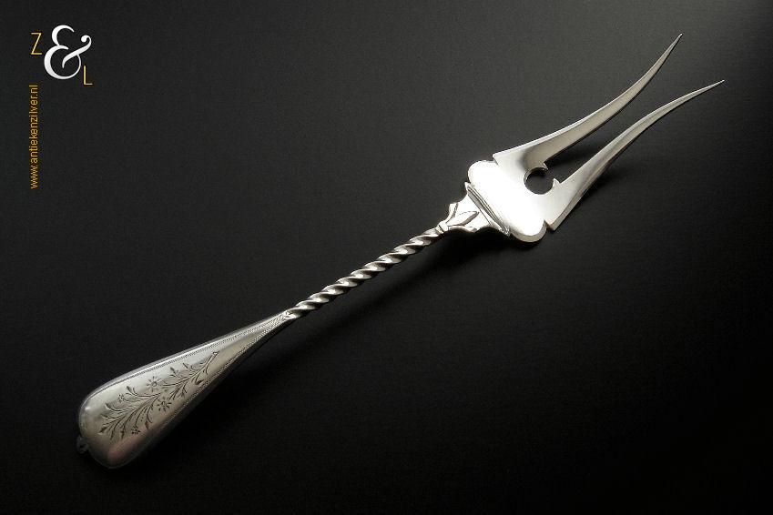 Visdienschep / visschep gemaakt in Rotterdam door de Firma Lang & Koops (Jacob Lang & Christiaan Koops) (meesterteken L&K boven passer in vierkant) in het jaar 1853 (jaarletter T). Deze geheel op de hand gemaakte zilveren Biedermeier visdienschep / visschep is met c-vormige voluten gegraveerd, weegt 101 gram en is 28.8 cm lang, de schep meet 15.1 cm bij 8.9 cm. De visdienschep / visschep heeft aan de achterzijde van de schep twee héél kleine scheurtjes die niet door en door zijn (zie afbeelding met rood omlijnde detailfoto linksboven).