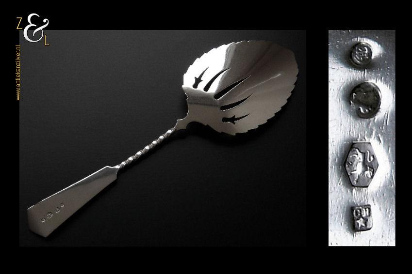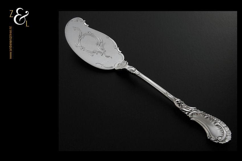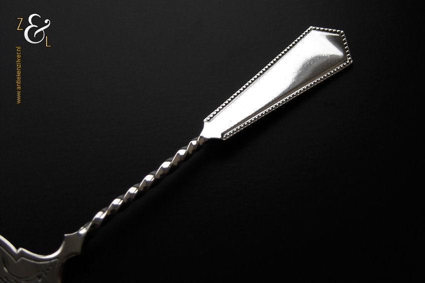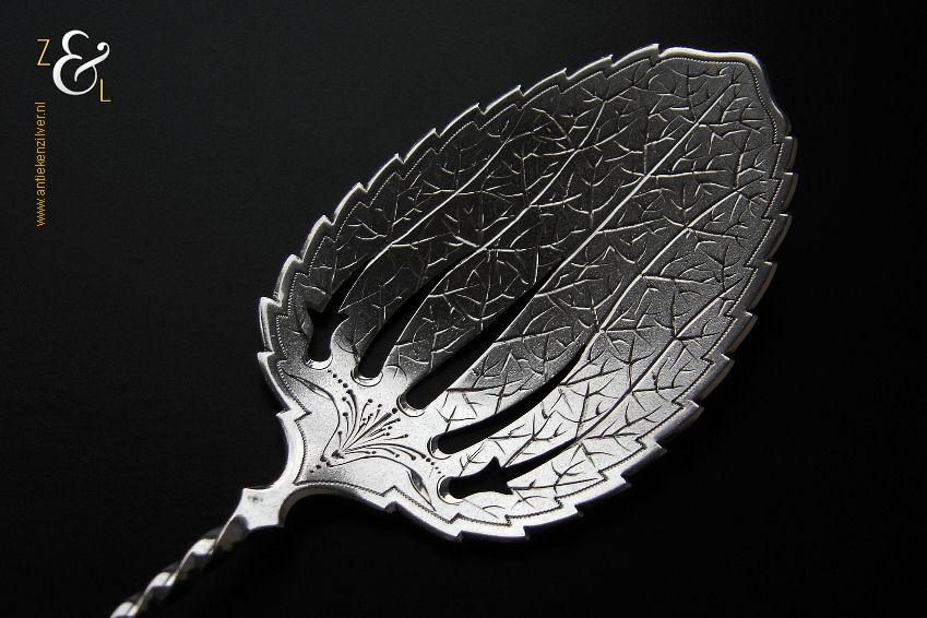 Deze natfruitschep / pasteischep / petitfourschep is gemaakt in Utrecht bij de Koninklijke Utrechtse Fabriek van Zilverwerk C.J. Begeer (meesterteken CB boven ster in vierkant) in het jaar 1896 (jaarletter M). De zilveren Art Nouveau natfruitschep / pasteischep / petitfourschep heeft een getordeerde steel en een handvat die met parelrand is uitgevoerd. Het schepgedeelte is uitgezaagd, gegraveerd en gematteerd (matteren is een bewerking waarbij de zilversmid het oppervlak van een zilveren voorwerp een matte structuur geeft). De natfruitschep / pasteischep / petitfourschep weegt 61 gram en is 22 cm lang. Het schepgedeelte is 9.5 cm lang bij 6.2 cm breed.