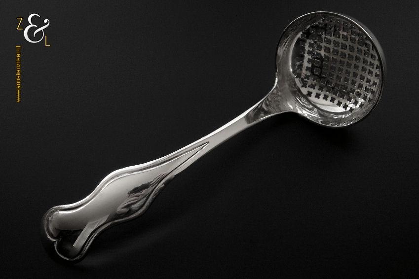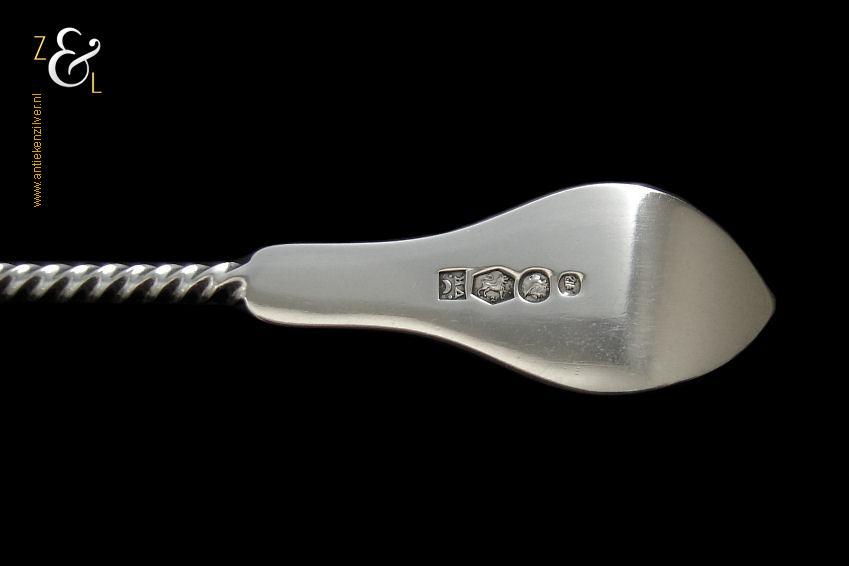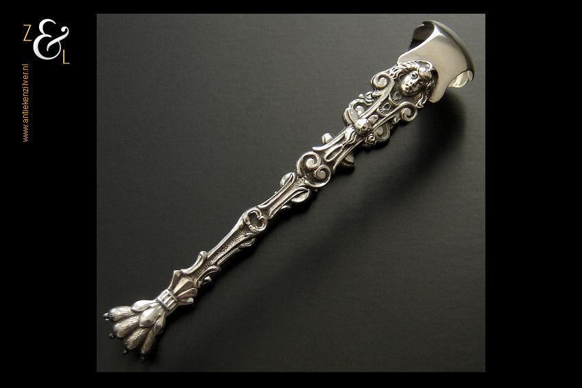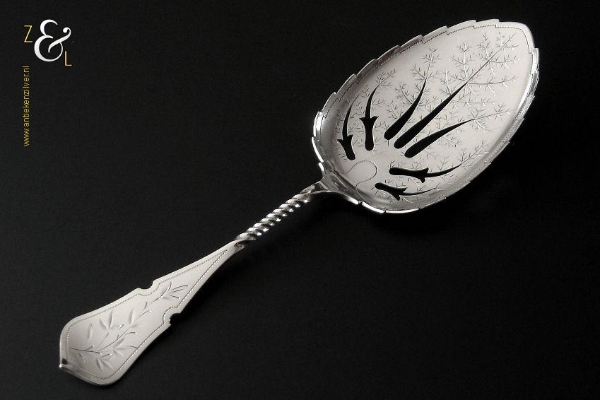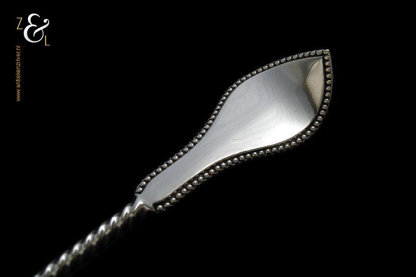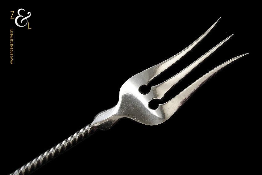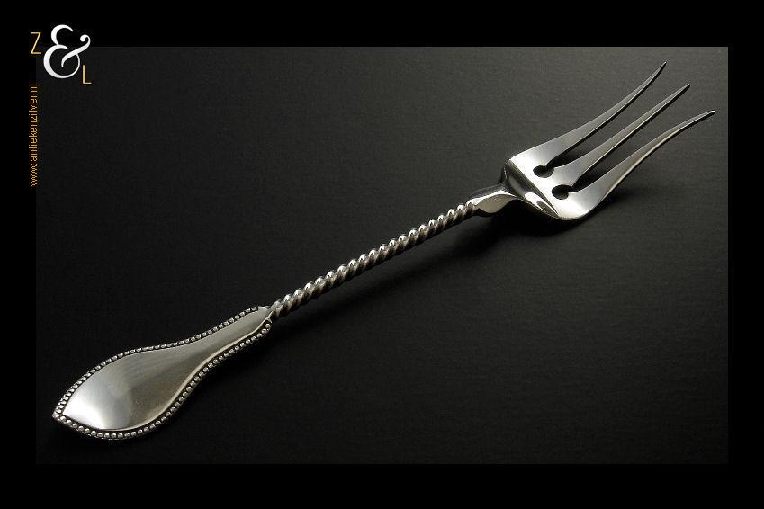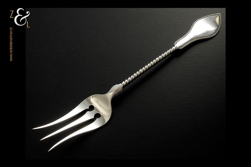 Belegvork / zuurvork gemaakt in Voorschoten bij de Firma J.M. van Kempen & Zonen (meesterteken liggend maantje tussen punten boven VK in vierkant) in het jaar 1897 (jaarletter N). Deze zilveren Jugendstil belegvork / zuurvork heeft een getordeerde steel en handvat met parelrand. De belegvork / zuurvork weegt 31 gram en is 16.6 cm lang.