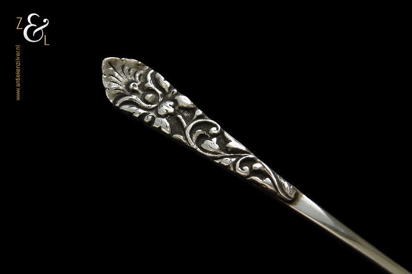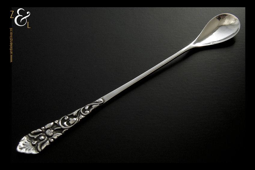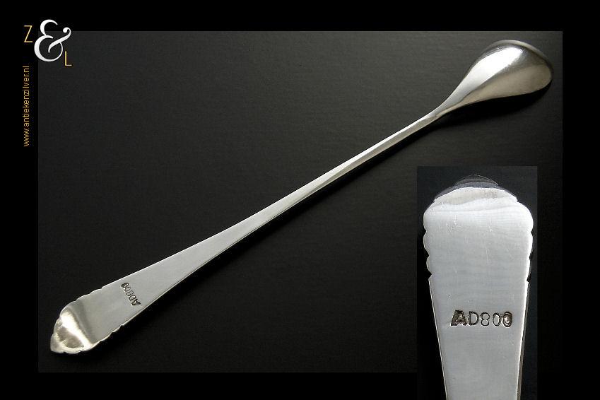 Deze Djokja / Yogyakarta longdrinklepel is gemaakt in Djakarta Indonesië. De lepel is gestempeld met het atelier of meesterteken AD, deze zilversmid of zilversmederij is bij ons nog onbekend. De steel van deze longdrinklepel die voorzien is van florale motieven weegt 16 gram en is 16.8 cm lang. Tevens is de longdrinklepel gestempeld met het zilverkeur 800 dat aangeeft dat het gehalte zilver bij deze lepels 800/000 is, dit noemen wij in Nederland ook wel derde gehalte zilver. De zilveren longdrinklepel is ook goed te gebruiken als koffie- of theelepel in een mok of als Cocktail-, Sorbet- of IJslepel.