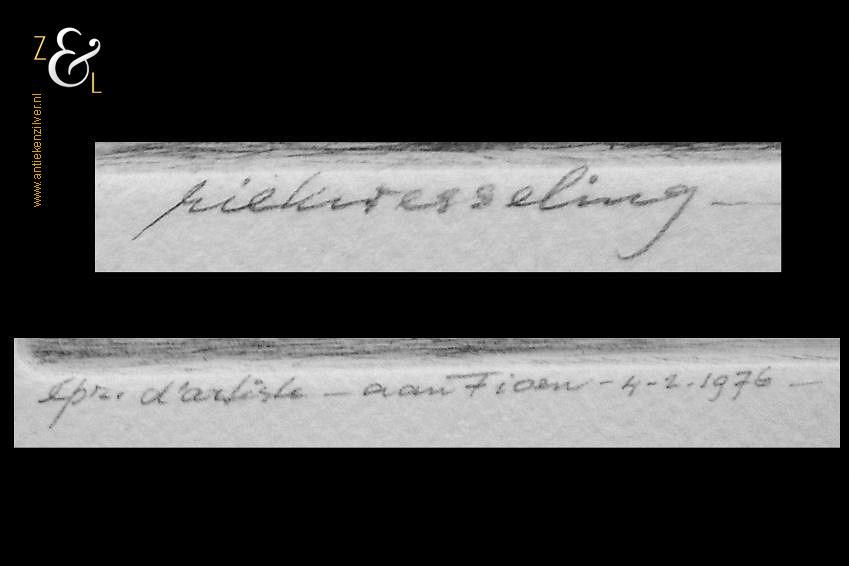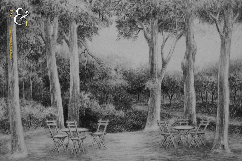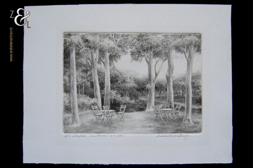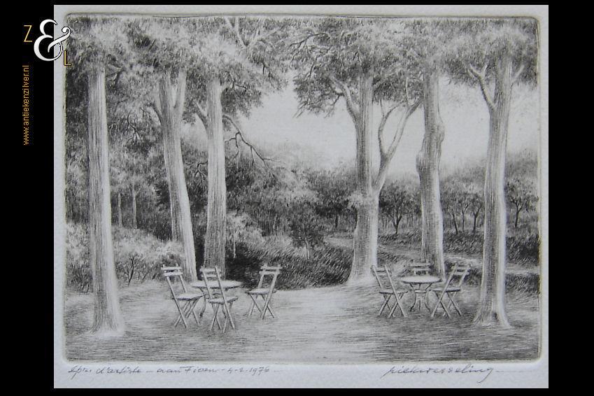 Droge naald gravure gemaakt door Riek Wesseling met de afbeelding van een uitspanning in een bos. De droge naald gravure die zij vermoedelijk in Amsterdam (waar zij vanaf 1950 woonde) gemaakt heeft, is rechtsonder met potlood gesigneerd: Riek Wesseling en linksonder staat: épr. d’artiste – aan Fioen – 4-2-1976 -. De droge naald gravure meet aan de buitenzijde 22 cm bij 16.6 cm de ets zelf is 14.5 cm bij 10.7 cm groot.