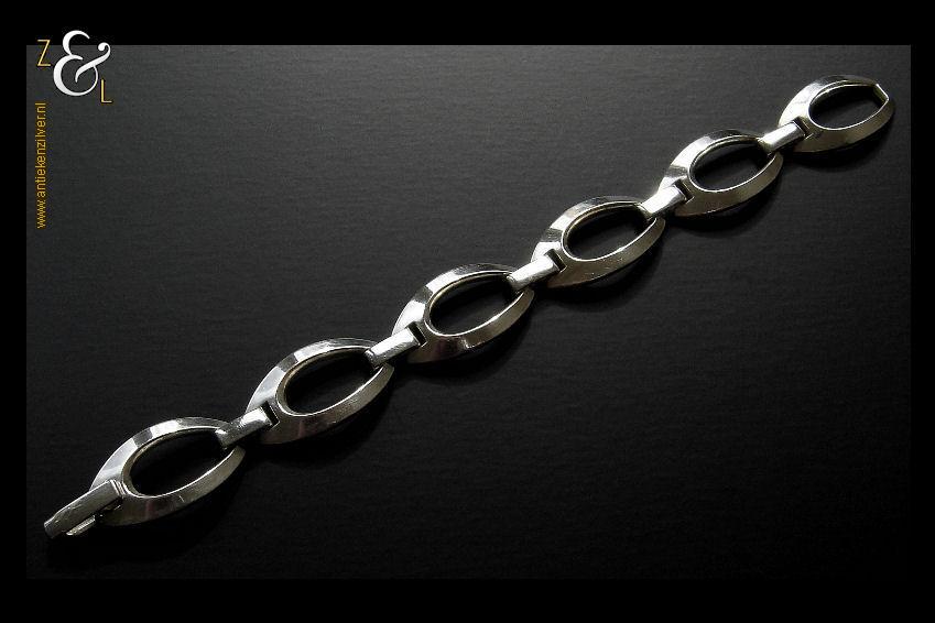 Deze massief zilveren schakelarmband is gemaakt in Nederland in de zeventiger jaren. De armband draagt het zilverkeur 835 voor 2e gehalte zilver is 19 cm lang 1.1 cm breed en weegt 18 gram.