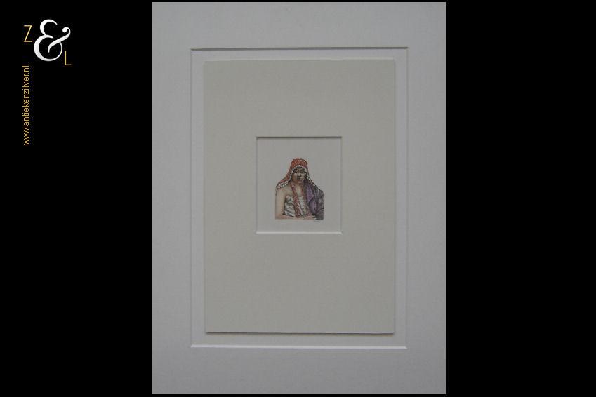 Deze aquarel / pentekening is gemaakt door Ger Daniëls en meet 9.7 cm bij 8.6 cm de buitenzijde van het dubbele passe partout meet 42 cm bij 31.5 cm. De miniatuur portrettekening is rechtsonder in potlood gesigneerd en gedateerd met initialen G.D. ’81.