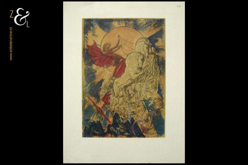 Deze zeefdruk met de titel “De ochtend” is gemaakt door Henk van Vessem. De zeefdruk is in potlood rechtsonder gesigneerd en gedateerd Vessem 2000 midden onder staat de titel “De ochtend” en linksonder staat de oplage 31/100. De zeefdruk is gemeten aan de binnenzijde van het passe partout 73 cm lang bij 44 cm breed. De buitenzijde van het passe partout is 90 cm lang bij 60 cm breed. Henk van Vessem “Ik werk vanuit mijn gevoel, mijn buik en zoek naar mogelijkheden om wisselende stemmingen en gevoelens uit te drukken”.