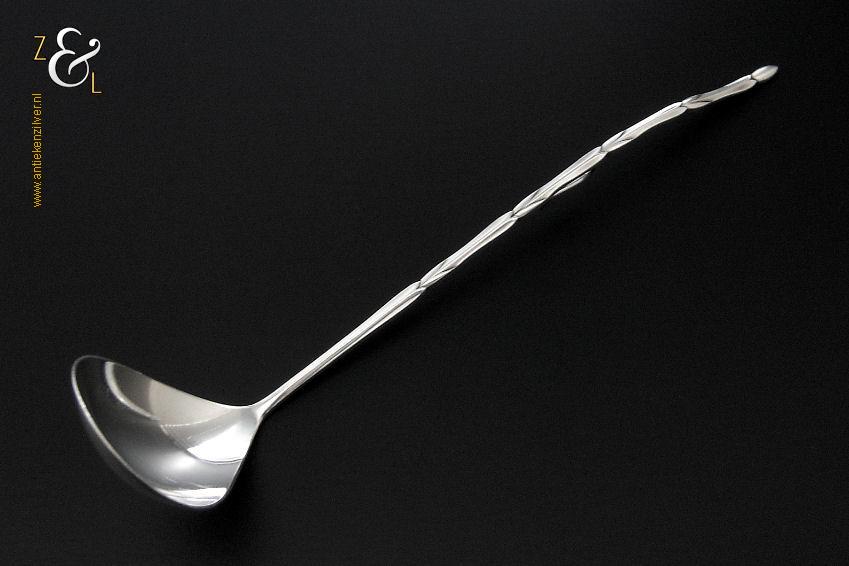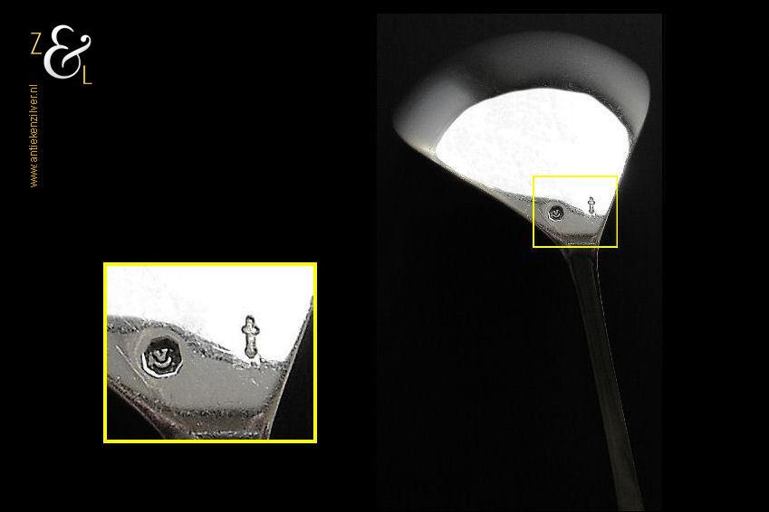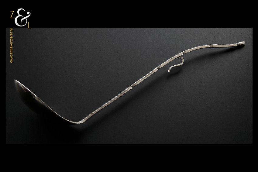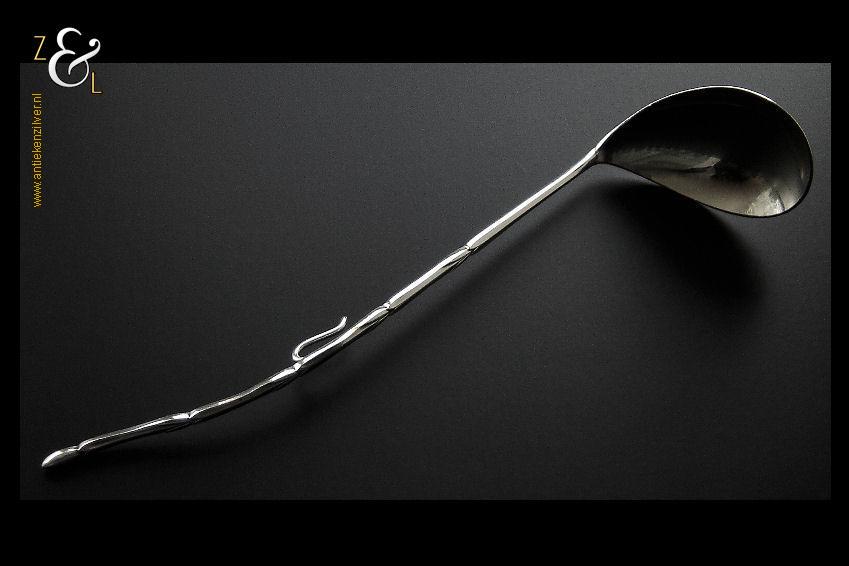 Jamlepel / confituurlepel gemaakt in Voorschoten door de Zilverfabriek Voorschoten N.V. (meesterteken: V boven liggend maantje in achthoek) tussen 1925 en 1953 (gekeurd met het zilverkeur zwaardje). Deze zilveren jamlepel / confituurlepel met haak weegt 27 gram en is 17.5 cm lang. De bak meet 5 cm lang bij 3.7 cm breed.