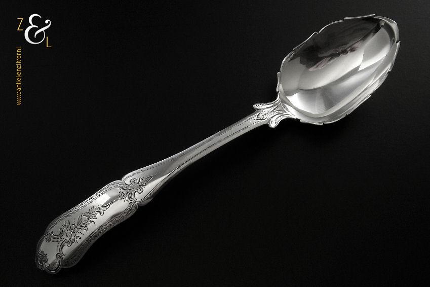 Mosterdlepel gemaakt in Amsterdam door Simon Woortman (meesterteken SW onder Zwaan in vierkant) in het jaar 1830 (jaarletter V). Deze in dubbelrondfilet uitgevoerde zilveren Empire mosterdlepel die nog sporen van verguldsel in de bak heeft weegt 11 gram en is 9 cm lang. De bak heeft een diameter van 2 cm.