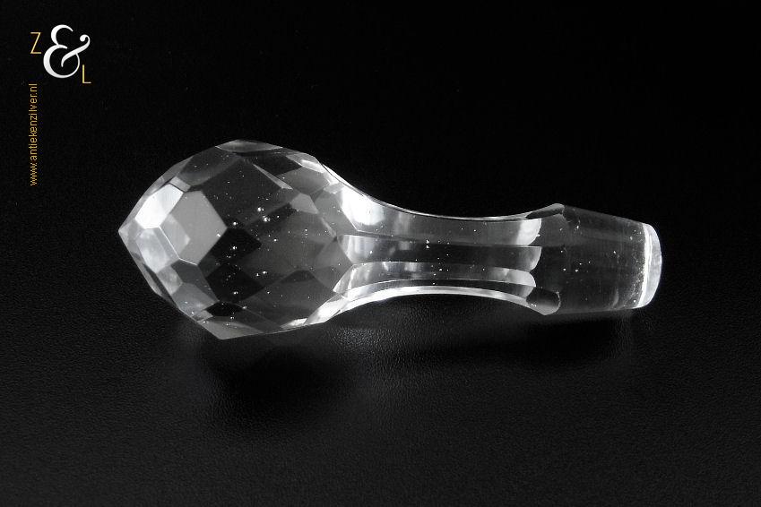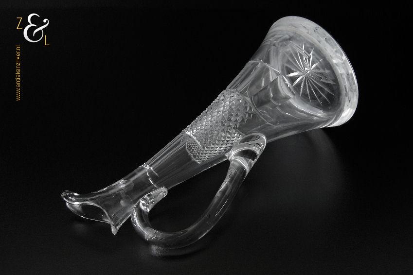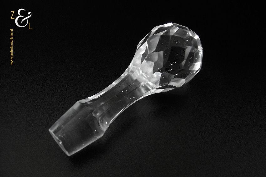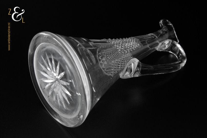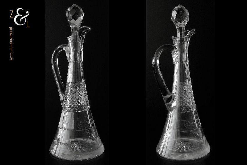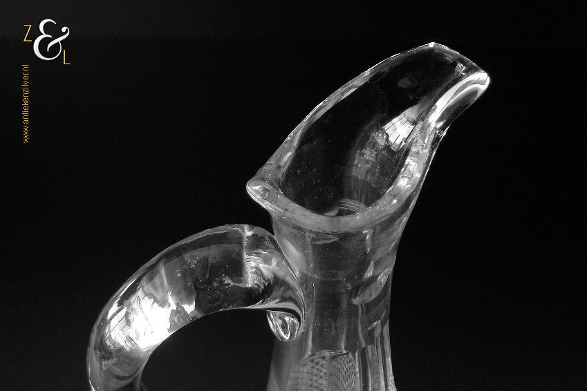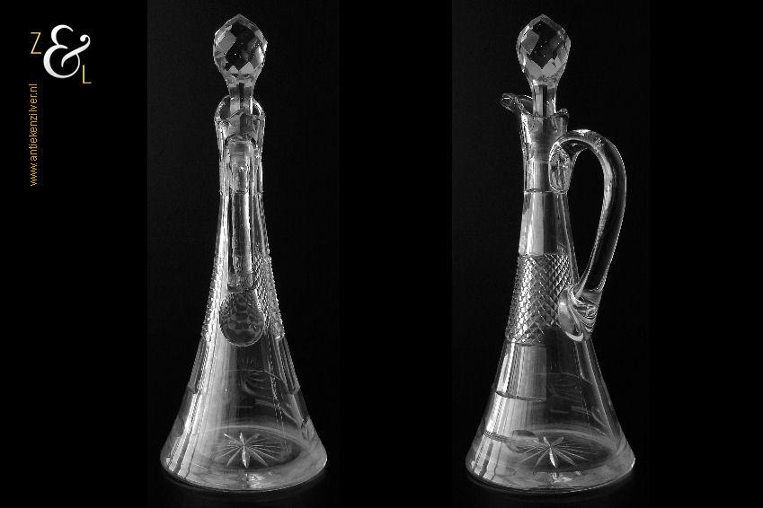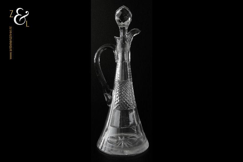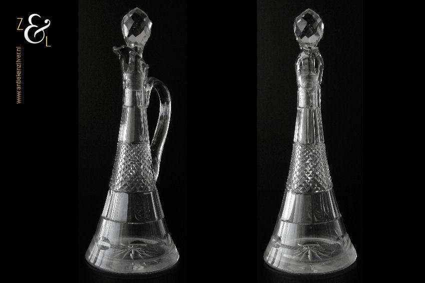 Deze Hollandse kristallen karaf met oor die uit het einde van de 19e eeuw stamt is mondgeblazen, handgeslepen en gepolijst. De karaf is bekroond met een facet geslepen stop die uitloopt in een punt en is verder (gezien van boven naar onder) geslepen met: drie ronde lenzen, zes ribben, een diamantpunt vlak, acht ribben, vijf olijven en aan de onderzijde op de bodem een ster. De karaf weegt 1054 gram heeft een diameter van 12.5 cm en is (inclusief stop) 32.5 cm hoog. De karaf heeft aan de binnenkant aanslag en aan de onderzijde van de stop zitten een paar kleine schilfertjes.