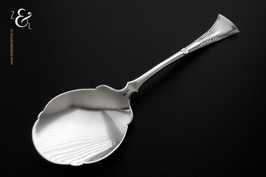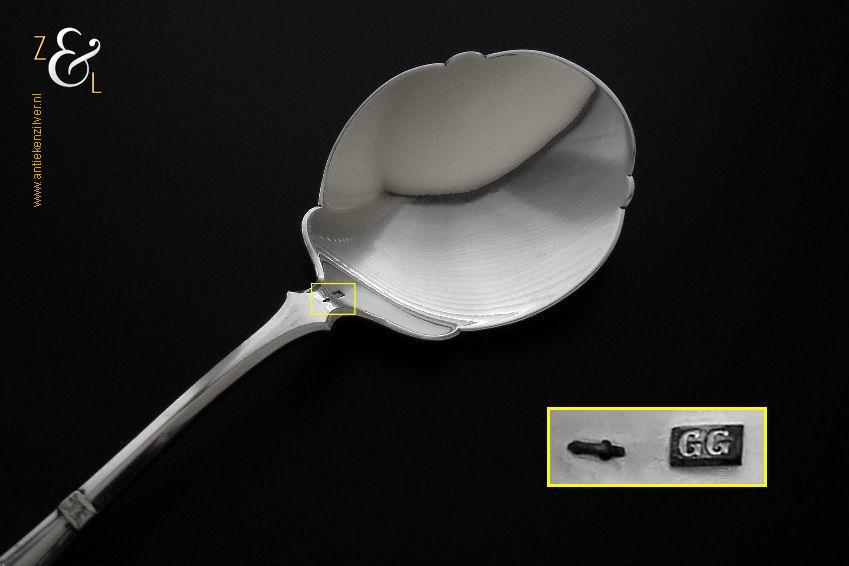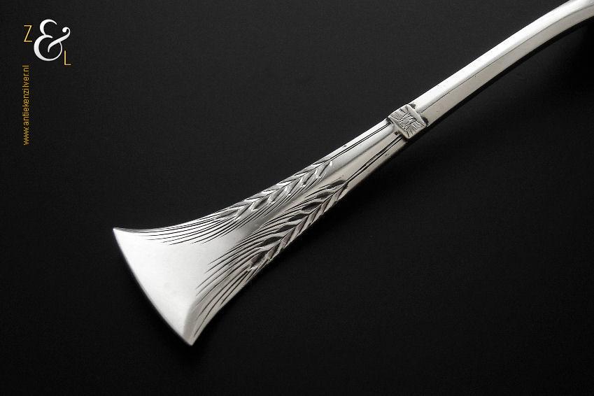 Deze dienlepel is gemaakt in Schoonhoven door Gerrit Regtdoorzee Greup (meesterteken GG in rechthoek) tussen 1888 en 1905 (gekeurd met het zilverkeur zwaardje). De zilveren Jugendstil dienlepel waarvan het uiteinde van de steel gegraveerd is met korenaren weegt 50 gram en is 19.1 cm lang. Het schepgedeelte is 7.5 cm lang bij 6.1 cm breed.