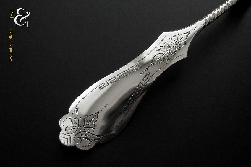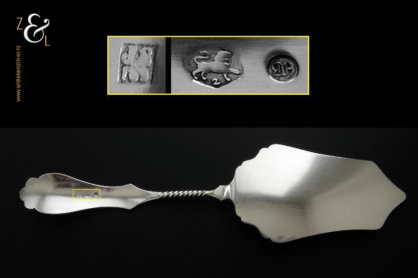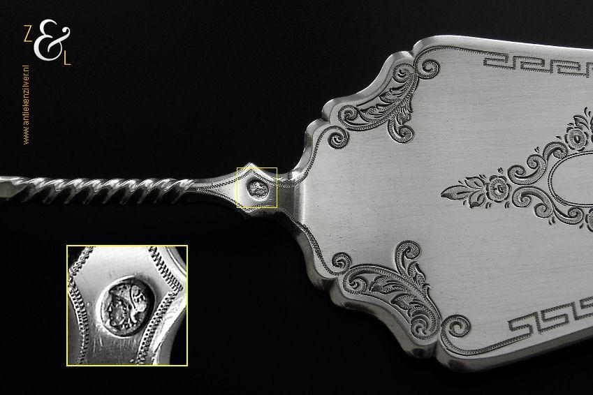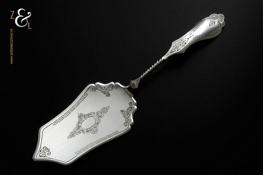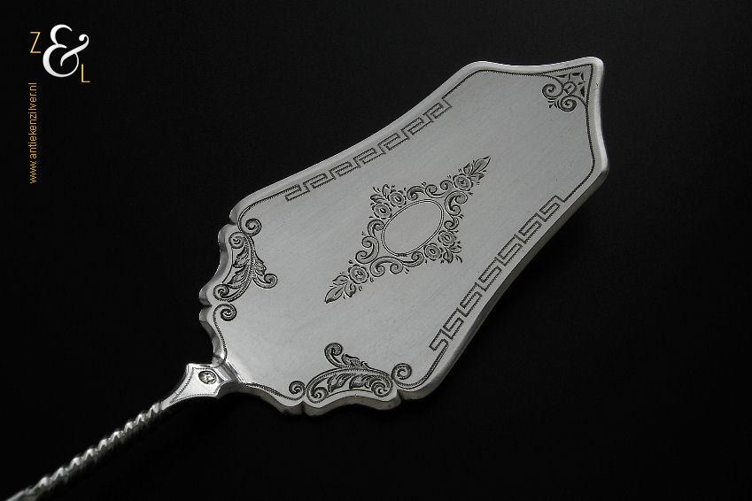 Taartschep gemaakt in Woudsend / Sneek Friesland door Johannes Schijfsma (meesterteken JS boven 189 in vierkant) in het jaar 1896 (jaarletter M). De zilveren in Jugendstil uitgevoerde taartschep heeft een getordeerde steel en zowel de schep als handvat is sierlijk gegraveerd met c-vormige voluten bloem- en meandermotieven. De taartschep weegt 55 gram en is 21.8 cm lang. Het schepgedeelte is 9.7 cm lang bij 5.4 cm breed. De taartschep heeft gebruikssporen.