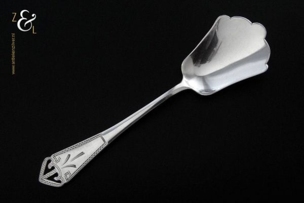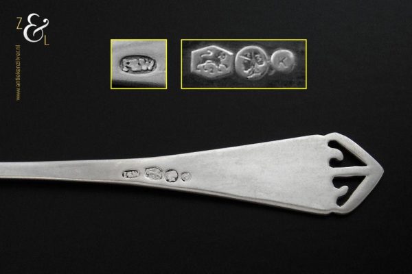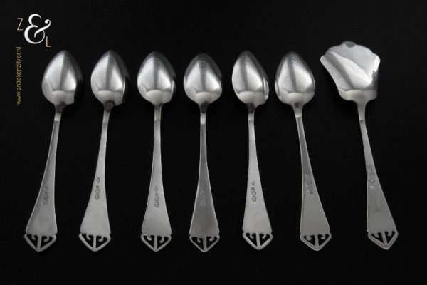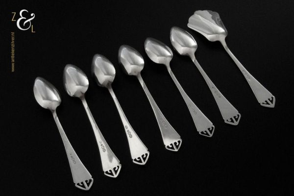 Deze 6 koffielepels / theelepels met bijpassende suikerschep zijn gemaakt in Schoonhoven bij de Firma de Pleijt & de Wilde (meesterteken P&W in ovaal) in het jaar 1920 (jaarletter K). De zilveren Art Deco koffielepels / theelepels en suikerschep waarvan het uiteinde van de stelen fijntjes uitgezaagd en gegraveerd zijn wegen 64 gram. De lepels zijn 11.1 cm lang en de suikerschep is 11.9 cm lang.