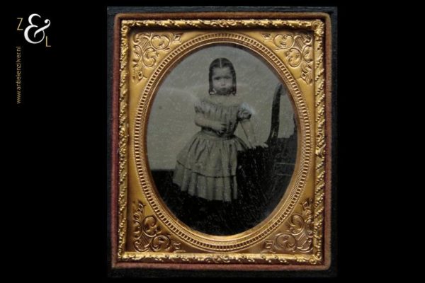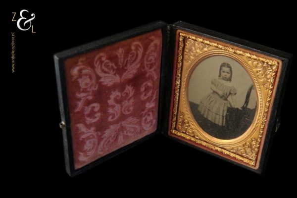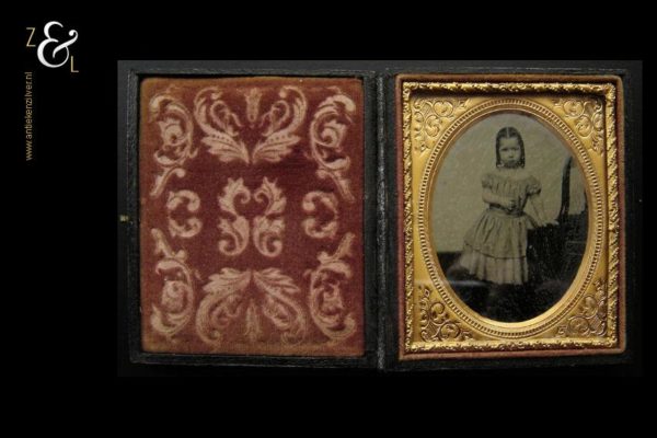 Deze Ambrotype of Ambrotypie met het portret van een meisje naast een stoel stamt uit Engeland 19e eeuw, circa 1860, de Victoriaanse periode. Het mooi bewerkte foedraal waarin het portret is opgeborgen weegt 108 gram en meet in gesloten toestand 9 cm lang 8 cm breed en 1.5 cm hoog. Het foedraal heeft een oude restoratie, de twee helften zijn met zwart linnen tape (wat boekbinders gebruiken) opnieuw aan elkaar bevestigd (zie afbeelding).