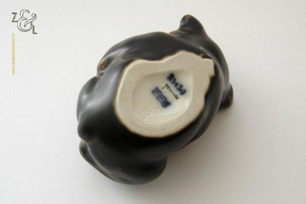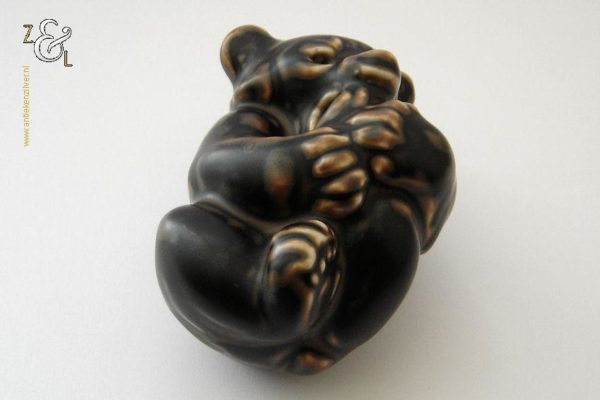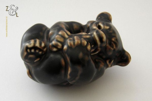 Dit beeld / plastiek van een spelende bruine beer welp die liggend op zijn rug aan zijn poot sabbelt is uitgevoerd in geglazuurd gres aardewerk. Aan de onderzijde is de beer gemerkt met in het blauw modelnummer 21434, met daaronder in het groen DENMARK, de drie blauwe golven die symbool staan voor de Sont, de Grote Belt en de Kleine Belt de zeestraten die tussen de Deense eilanden lopen en tevens het merk voor de porseleinfabriek Royal Copenhagen te Denemarken is en het blindmerk KK voor de ontwerper Knud Kyhn. Het beeld / plastiek weegt 183 gram is 8.3 cm lang 6 cm breed en 5.7 cm hoog.