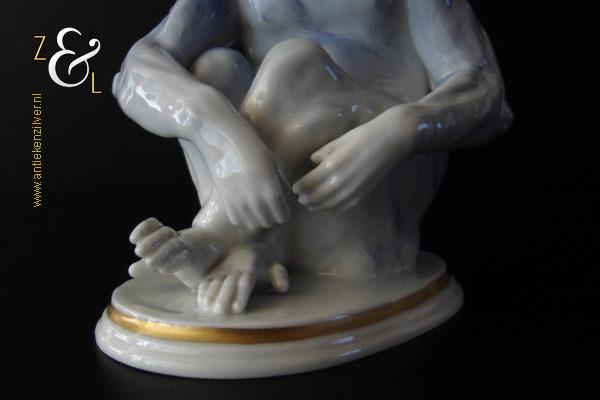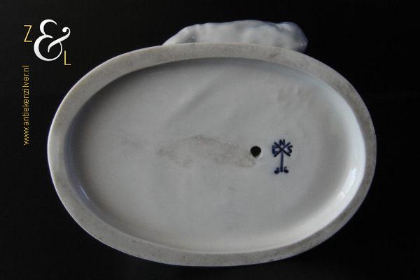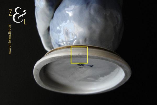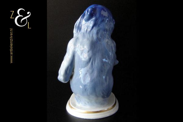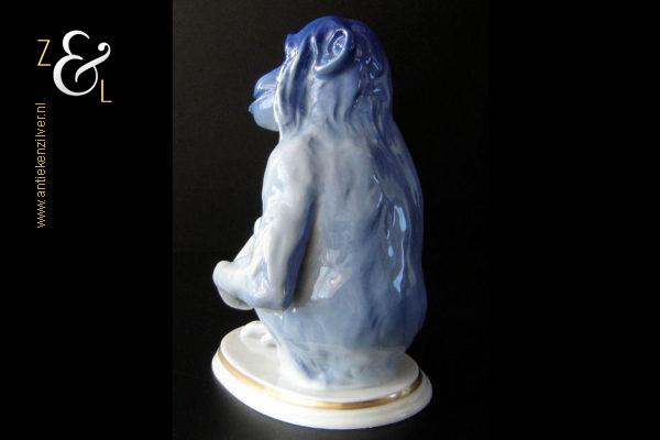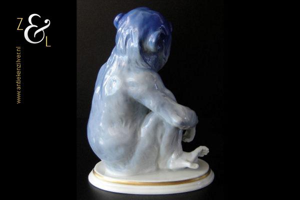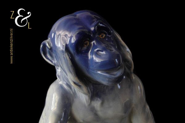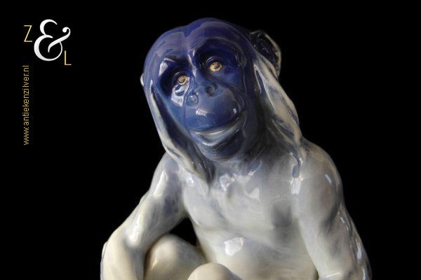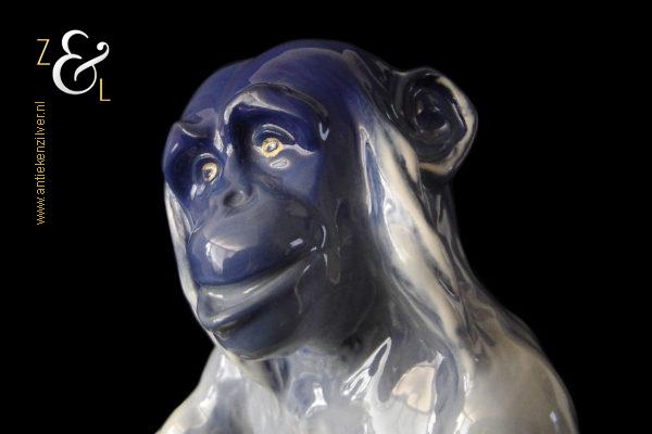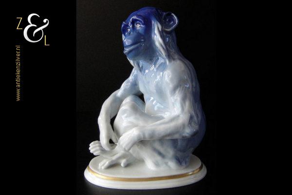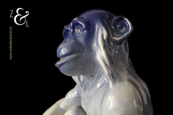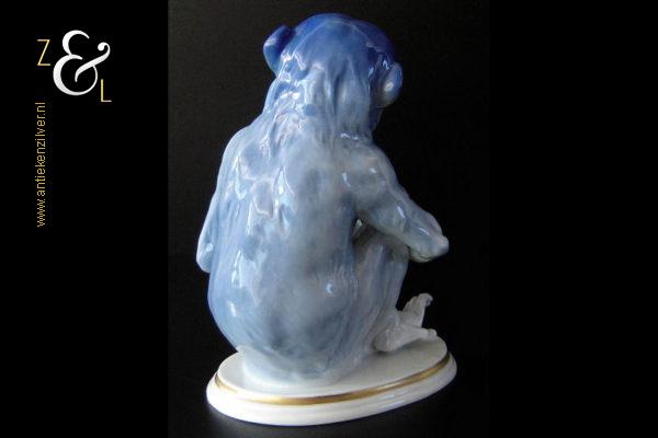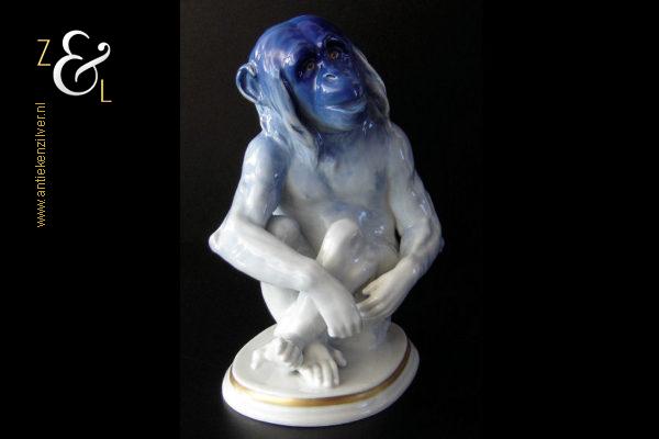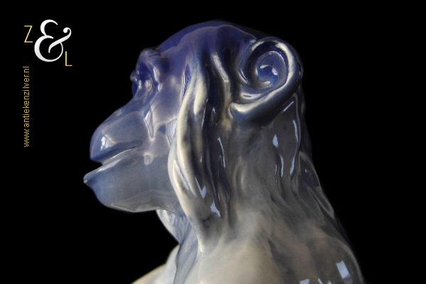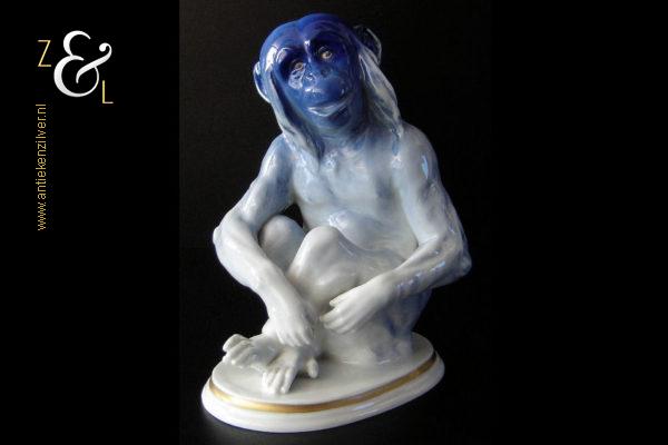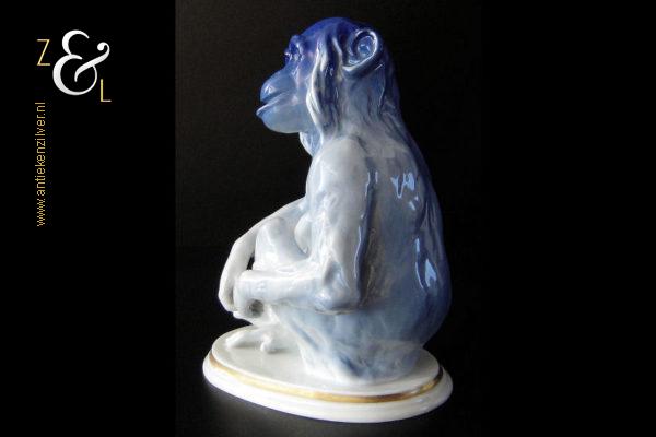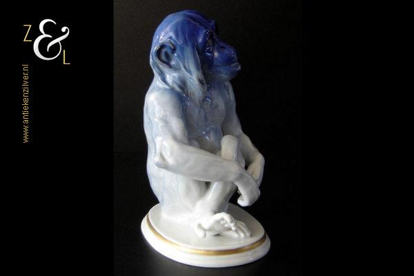 Dit beeld / plastiek van een aap is gemaakt door Porseleinfabriek ENS in Volkstedt Duitsland. De bijzondere wit blauw geglazuurde porseleinen aap is opgehoogd met goud en draagt aan de onderzijde het blauwe ENS windmolen merk voor porselein gemaakt tussen 1945 en 1972. Het beeld plastiek weegt 354 gram en is 15.7 cm hoog. De ovale voet is 10.8 cm lang bij 8.2 cm breed. Aan de onderzijde van de voet zit een héél klein schilfertje zie geel omkaderd gedeelte op afbeelding.
