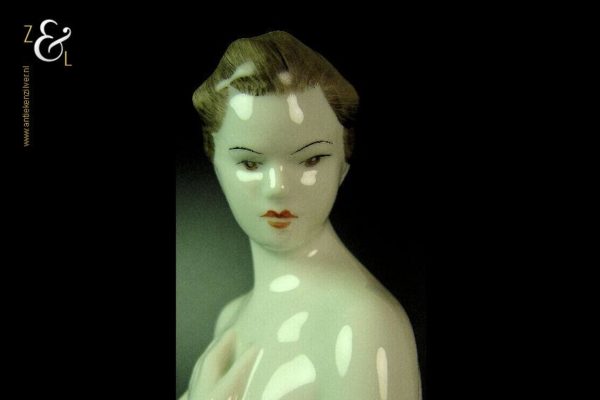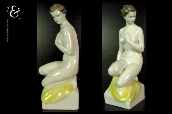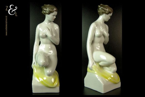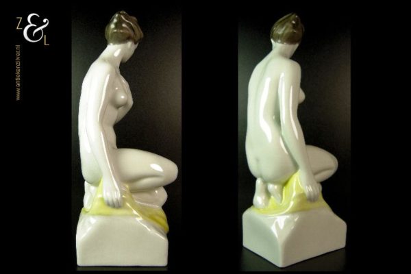 Dit porseleinen beeld / plastiek van een zittende naakte vrouw is gemaakt bij de porseleinfabriek Hollóháza in de plaats Hollóháza te Hongarije. Het beeld in de Art Deco stijl is gemerkt in groen met een dennenboom en met Hollóháza Kezzel Festett 1831. Het beeld weegt 1045 gram is 29 cm hoog en de voet is 10 cm lang en 8.5 cm breed.