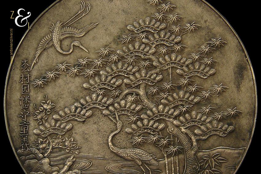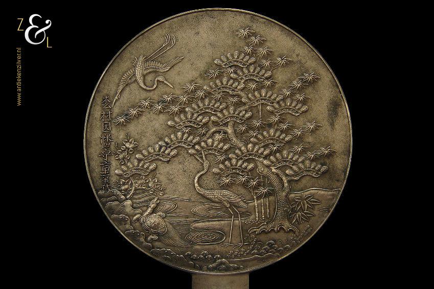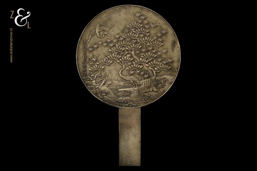 Antieke Japanse bronzen handspiegel (in het Japans kagami) met een gedetailleerde decoratie van een schildpad, kraanvogels, pijnbomen, bamboe en stromend water. De handspiegel / kagami stamt uit het eind van de 19e begin 20e eeuw, de zogenaamde Meiji periode die liep van 1868 tot 1912. Wij hebben de karakters aan de linkerkant van de handdspiegel nog niet kunnen vertalen. De zware bronzen spiegel weegt 711 gram en meet inclusief handvat 28 cm, de spiegel heeft een diameter van 18.2 cm. De handspiegel / kagami heeft gebruikssporen.