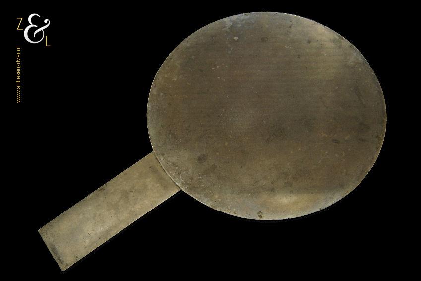 Bovenstaande handspiegel stamt uit het eind van de 19e begin 20e eeuw, de zogenaamde Meiji periode die liep van 1868 tot 1912. De handspiegels die vaak werden gegeven als huwelijksgeschenk hebben aan één zijde een een laagje tin dat net zolang gepolijst werd totdat men een mooi reflecterend (spiegelend) oppervlak kreeg. Zelfs nu kan je nog de reflectie van je gezicht zien in deze spiegel die toch zo’n honderdvijftig jaar oud is.