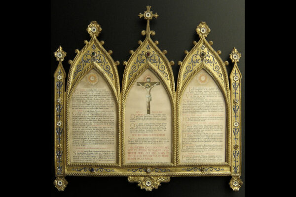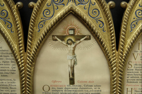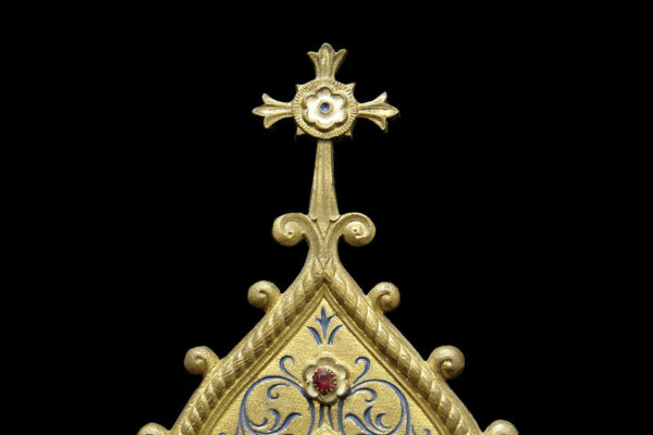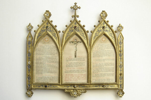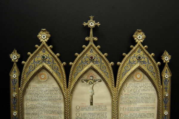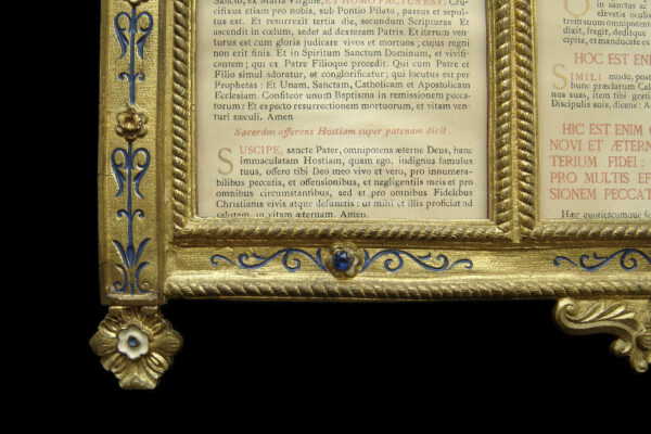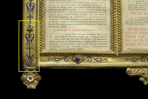 Dit canonbord dat het middelste deel van een driedelig stel is, is gemaakt in Frankrijk in de tweede helft van de 19e eeuw in de Neogotische stijl. Het canonbord is gemaakt van verguld messing en gedecoreerd met blauw en wit in de champlevé emailleringstechniek. Tevens is het canonbord uitgevoerd met gefacetteerde glazen steentjes waarvan er twee missen (zie geel omkaderde gedeeltes op de afbeeldingen). Van het canonbord is het linker pootje héél licht verbogen en heeft een paar kleine (krimp)scheurtjes (zie geel omkaderd gedeelte op de afbeelding). Het canonbord heeft aan de voorzijde het nog originele glas en is aan de achterzijde gestoffeerd met de authentieke rode stof. Het canonbord weegt 2620 gram is 41.8 cm lang bij 38.6 breed.