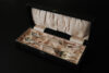 Deze goudstofdoos (Abamphruwa)* is gemaakt in Ghana West Afrika door het Akan volk* (Ashanti cultuur) aan het einde van de 19e eeuw / begin 20e eeuw. De op de hand vervaardigde messing goudstofdoos die gemaakt is in de verloren wasmethode* heeft een donkere patina en een deksel met een geometrisch patroon in reliëf. De goudstofdoos die een verouderde donkere patina heeft is 7.2 cm lang bij 4.6 cm breed bij 3.3 cm hoog (inclusief deksel) en weegt 367 gram.