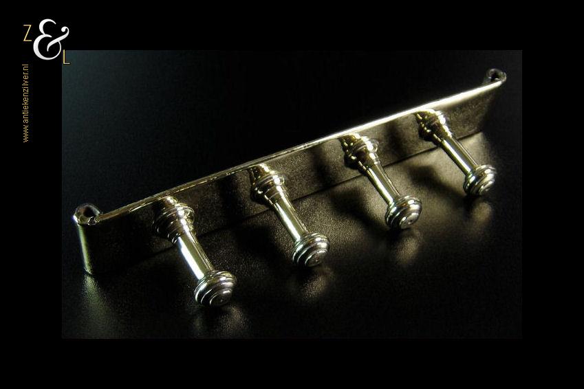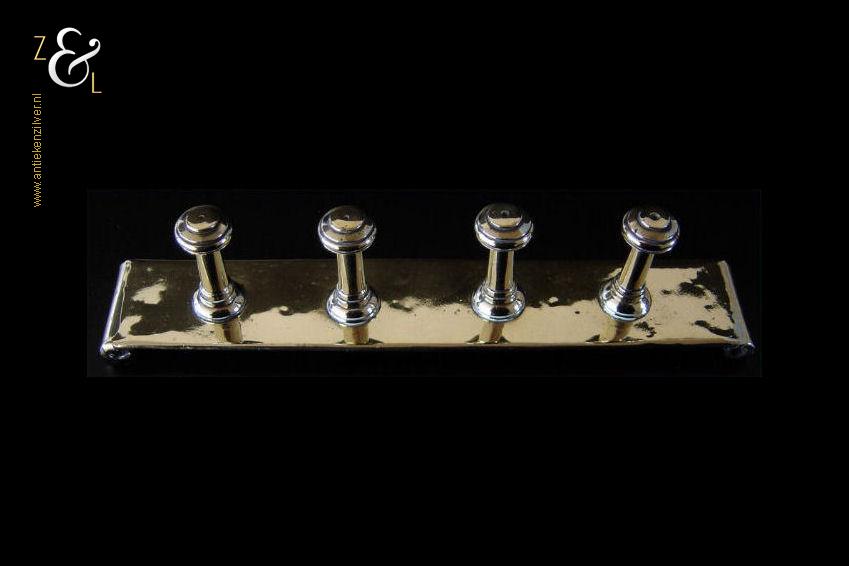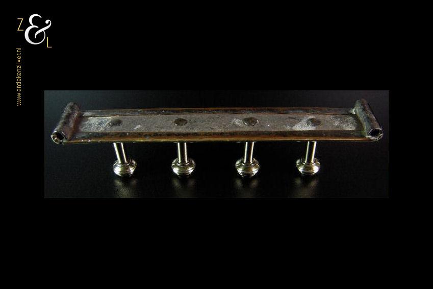 Dit kapstokje / wandrekje is gemaakt in Nederland in de laat 18e vroeg 19e eeuw. Het op de hand gemaakte kapstokje / wandrekje is uitgevoerd met vier massief gegoten messing knoppen van 4.2 cm lang die vastgeklonken zijn op een ijzeren grondplaat die bekleed is met latoen of latoenkoper (dun messing of koper met veerkracht in de vorm van folie). Het kapstokje / wandrekje weegt 355 gram is 22.5 cm lang bij 3.8 cm breed en 4.5 cm hoog.