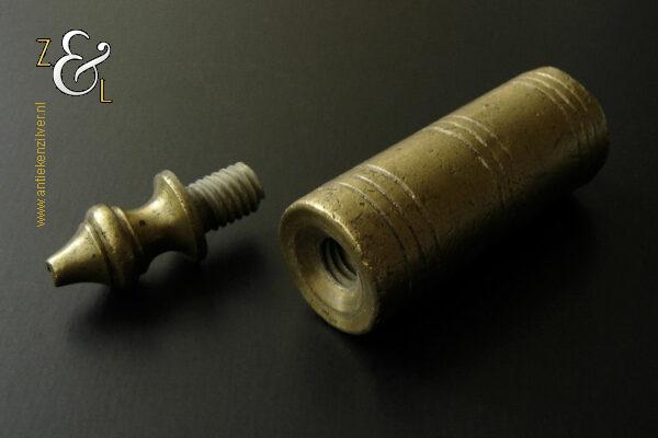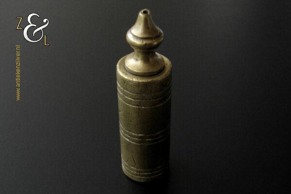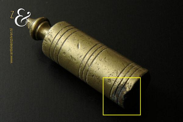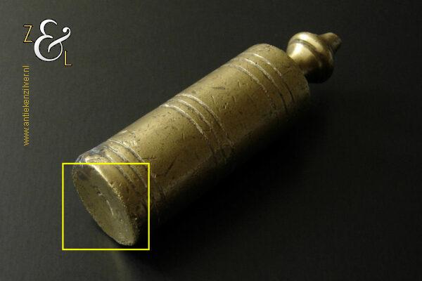 Dit schietlood, richtlood of paslood is gemaakt in Nederland en stamt uit de eerste helft van de 20e eeuw (1900 / 1950). Het schietlood is gemaakt van messing en heeft een cilindervorm. Aan de onderzijde van het schietlood staat het getal 4 (zie geel omkaderd gedeelte op de afbeelding). Het schietlood weegt 328 gram heeft een diameter van 2.6 cm en is 9.5 cm lang. Het schietlood heeft aan de onderzijde gebruikssporen (zie geel omkaderd gedeelte op de afbeelding).