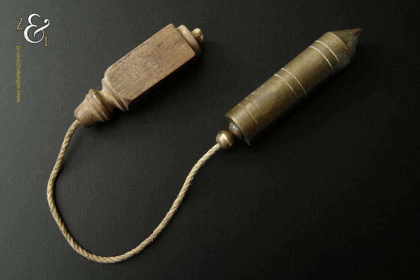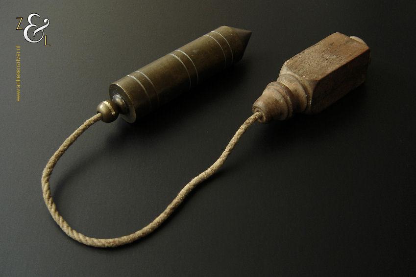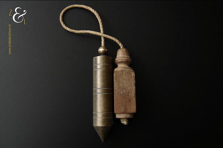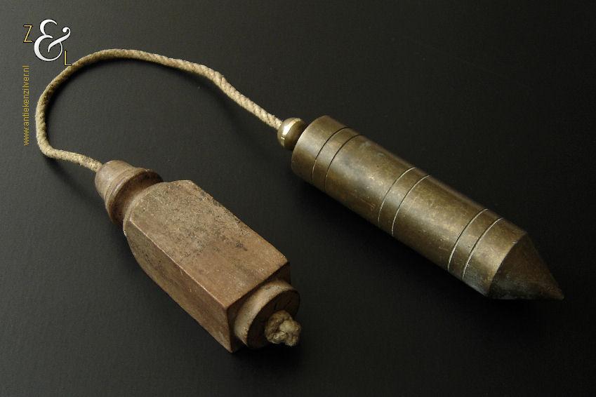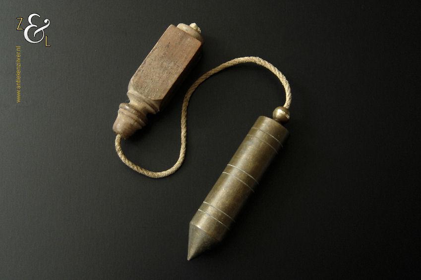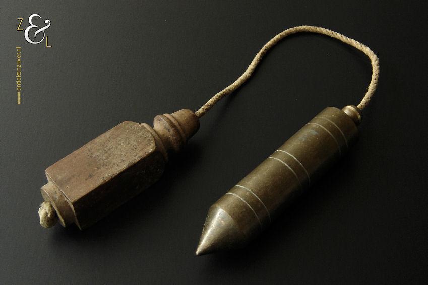 Dit schietlood, richtlood of paslood met houten klos is gemaakt in Nederland en stamt uit de tweede helft van de 20e eeuw (omstreeks de vijftiger jaren). Het schietlood is gemaakt van messing en heeft een cilindervorm met conische punt. Het schietlood weegt 422 gram heeft een diameter van 2.5 cm en is 12.2 cm lang.