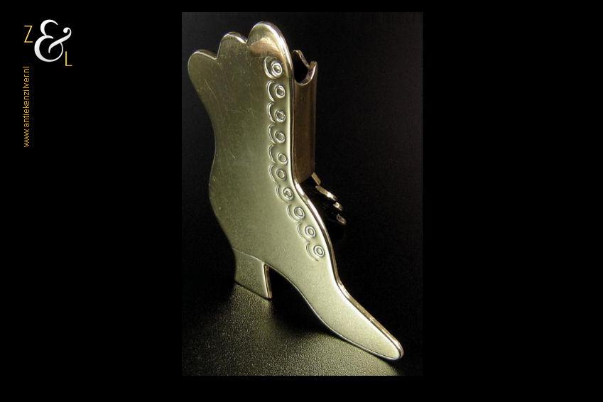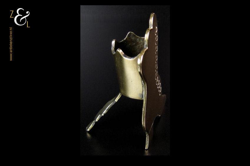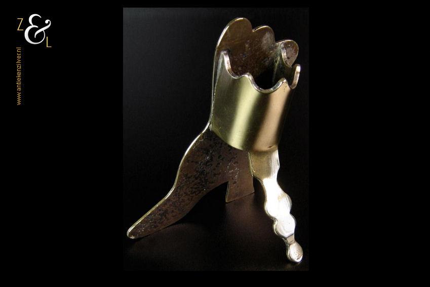 Deze in messing uitgevoerde “spill holder” in de vorm van een hooggeknoopte damesschoen is gemaakt in Engeland tijdens de tweede helft van de 19e eeuw de Victoriaanse periode die liep van 1837 tot 1901. De “spill holder” weegt 226 gram is 12.5 cm hoog 11 cm breed en 6.5 cm diep.