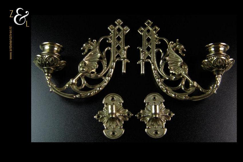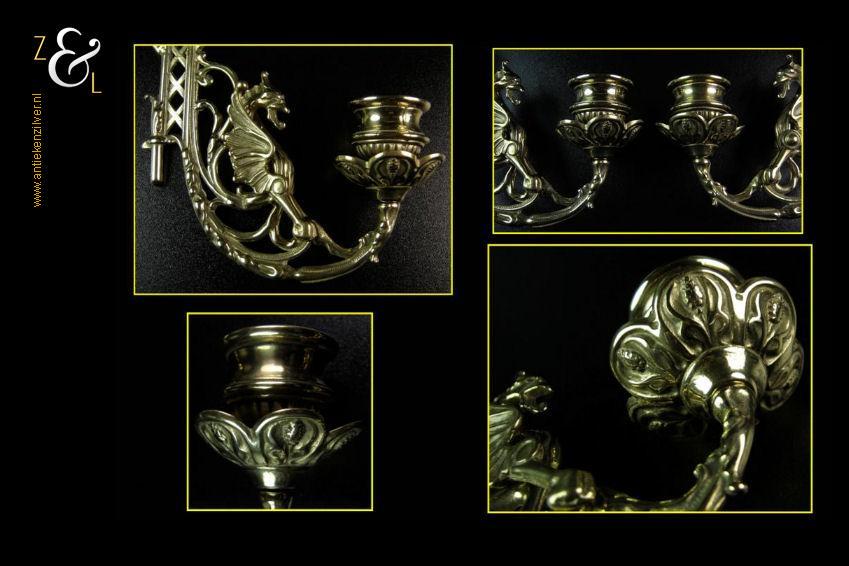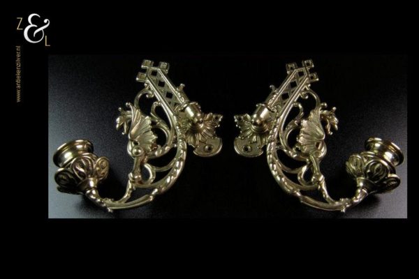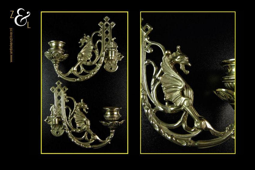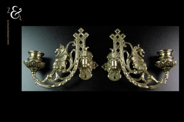 Dit stel messing piano kandelaars is een replica van antieke Engelse piano kandelaars uit de 19e eeuw. De twee gotische messing kandelaars zijn uitgevoerd met draken en kunnen scharnieren. Zij wegen samen 850 gram zijn plusminus 15 cm hoog en 18 cm breed. Men kan ze natuurlijk op een piano monteren maar ze staan ook heel mooi links en rechts naast een spiegel.