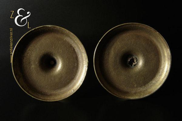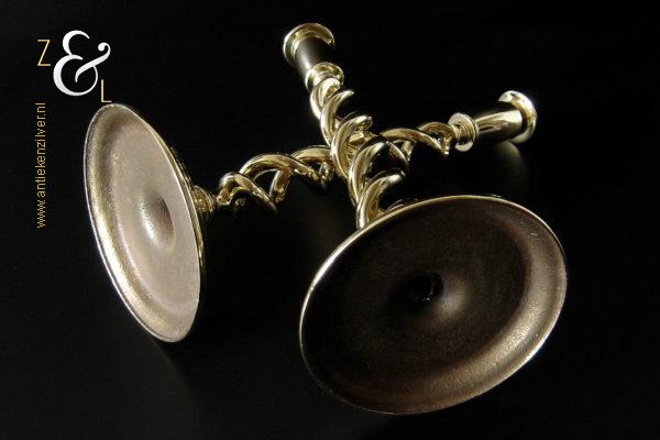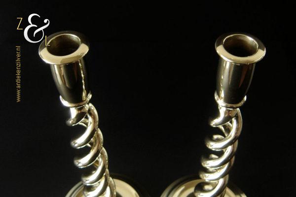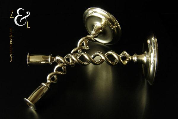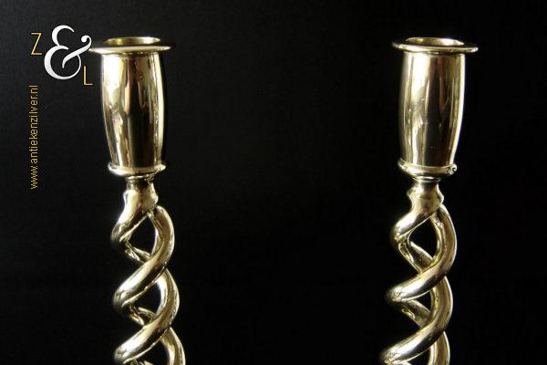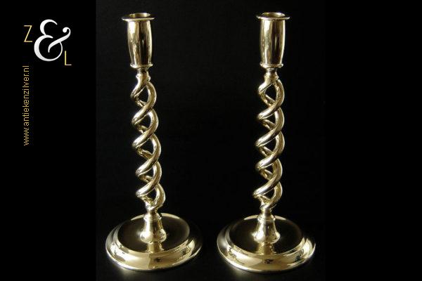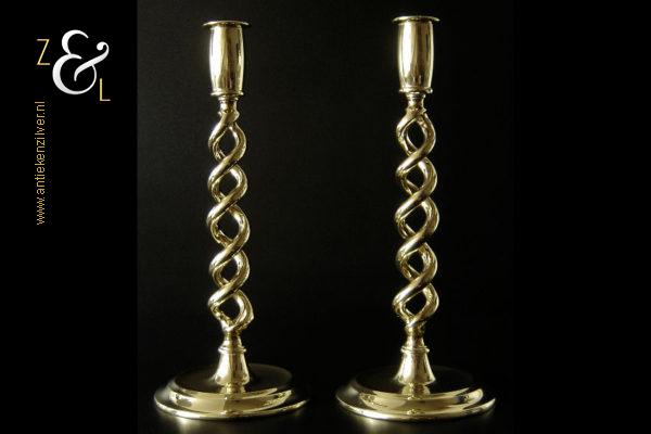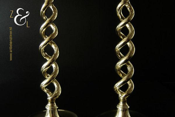 Dit stel messing open dubbel gedraaide kandelaars is gemaakt in Engeland aan het einde van de 19e eeuw / begin 20e eeuw. De kandelaars die in Nederland bekend staan onder de naam: open dubbel gedraaide of open twist kandelaars of in het Engels: open twist, double twisted of open Barley twist candlesticks zijn 29.2 cm hoog hebben een ronde voet met een diameter van 12.6 cm en wegen samen 1812 gram. De kandelaars zijn geschikt voor kaarsen met een diameter van 2.4 cm.