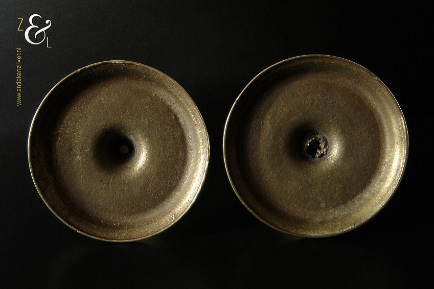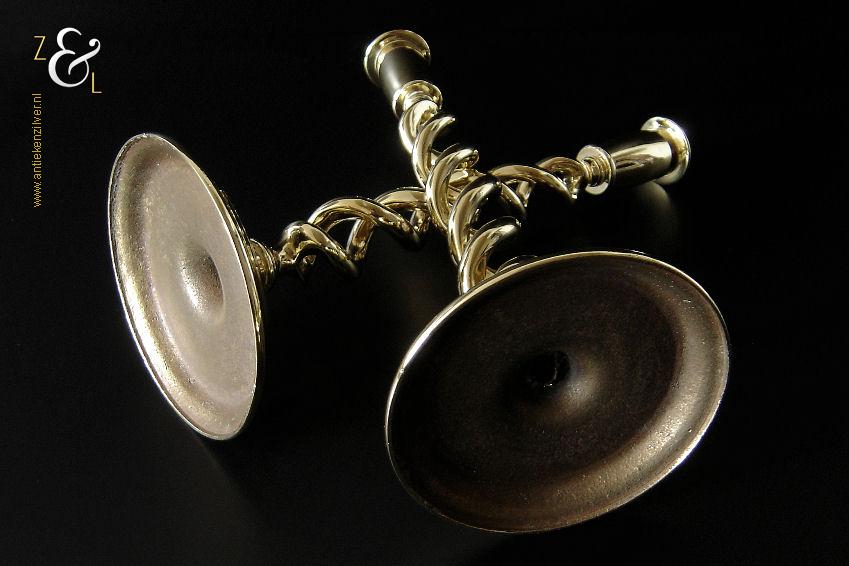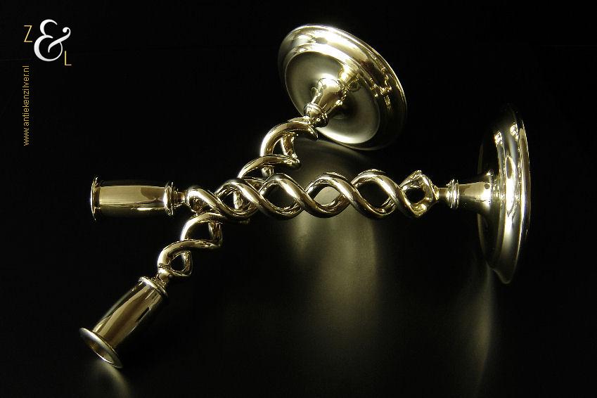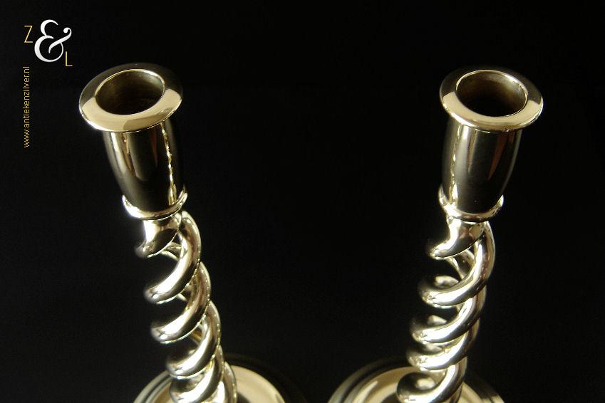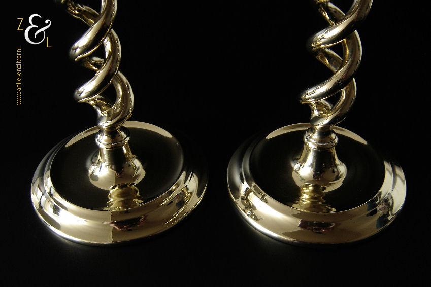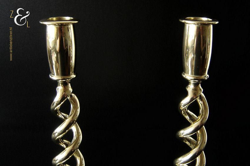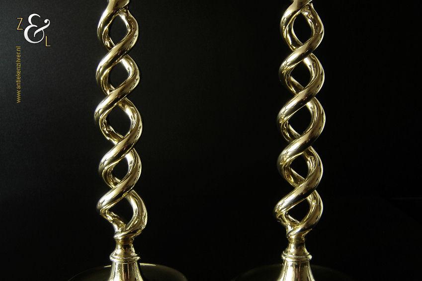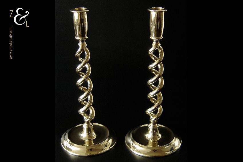 Dit stel messing open dubbel gedraaide kandelaars is gemaakt in Engeland aan het einde van de 19e eeuw / begin 20e eeuw. De kandelaars die in Nederland bekend staan onder de naam: open dubbel gedraaide of open twist kandelaars of in het Engels: open twist, double twisted of open Barley twist candlesticks zijn 29.2 cm hoog hebben een ronde voet met een diameter van 12.6 cm en wegen samen 1812 gram. De kandelaars zijn geschikt voor kaarsen met een diameter van 2.4 cm.