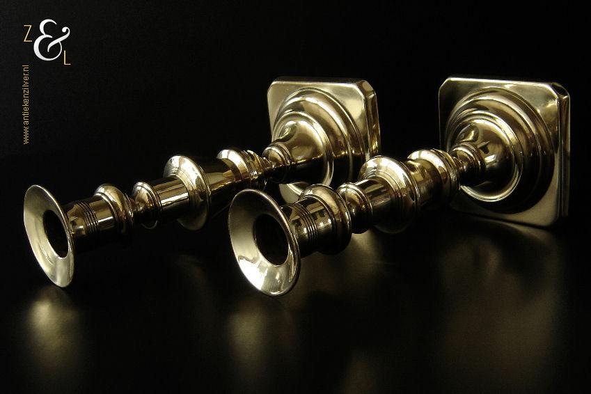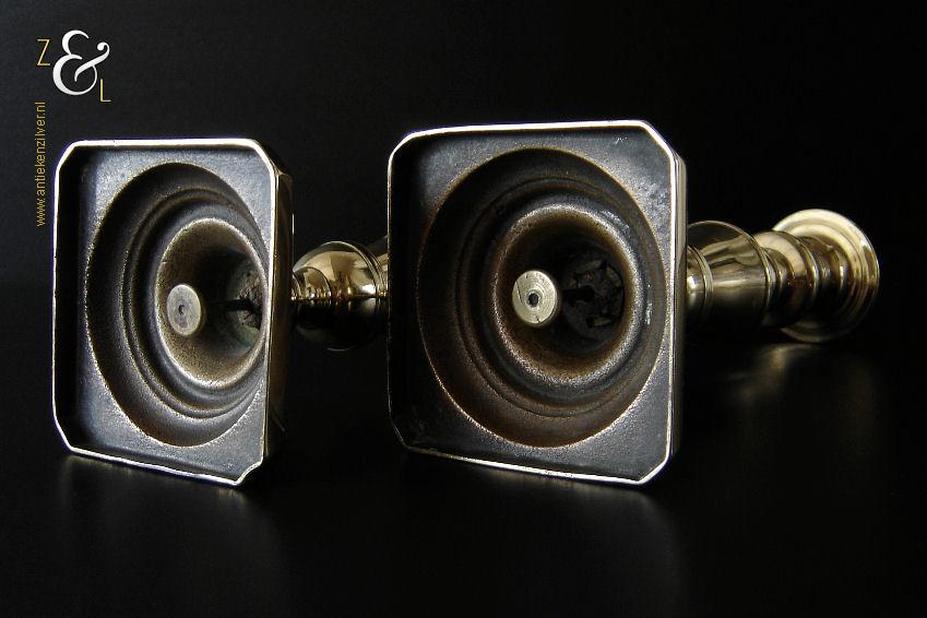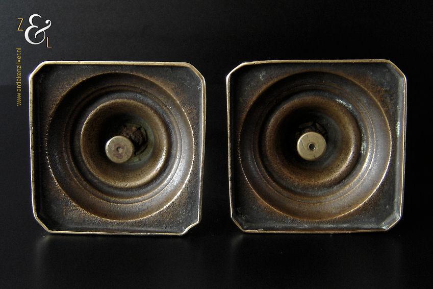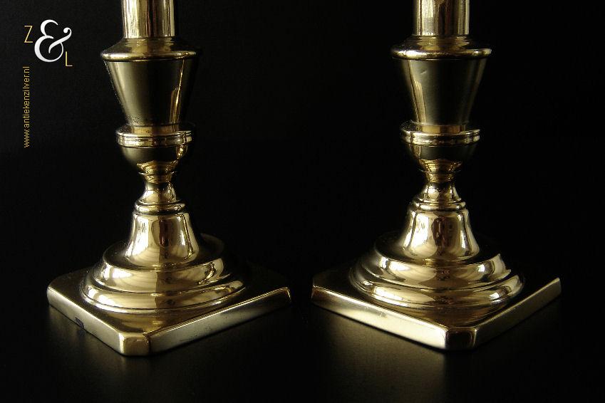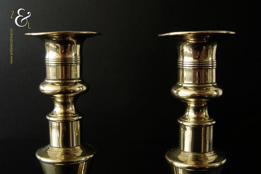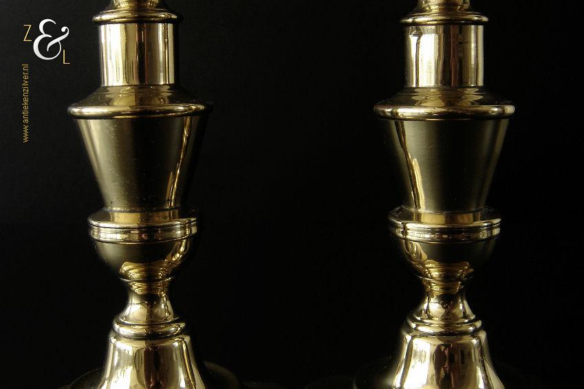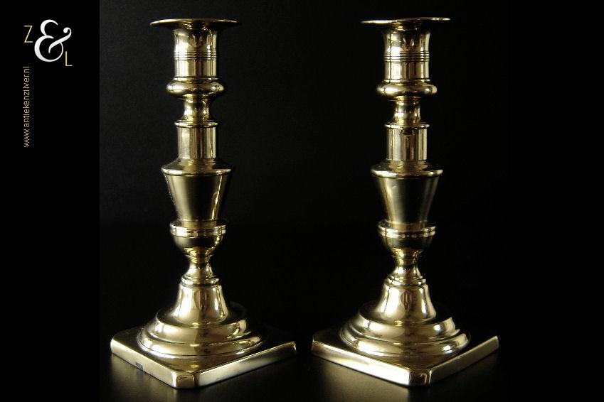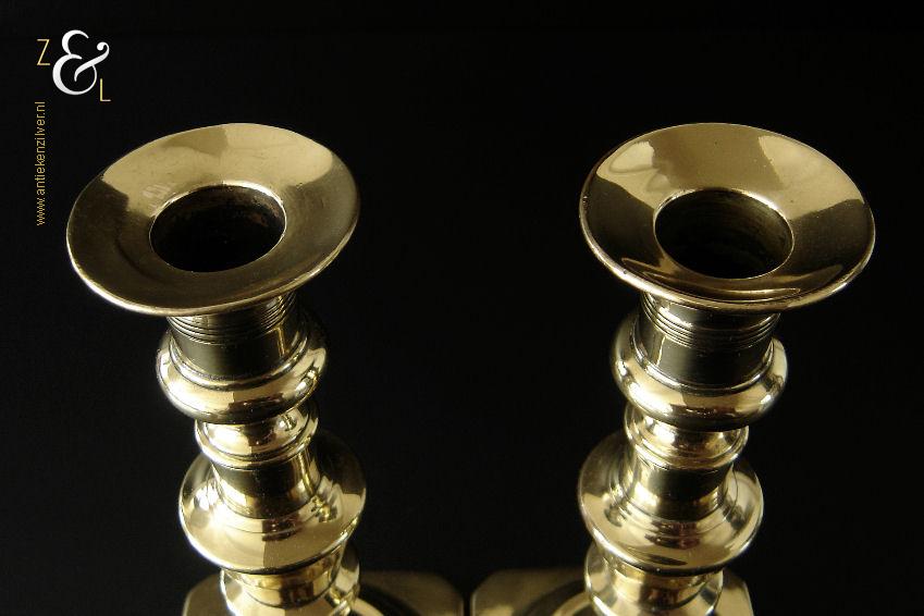 Dit stel messing kandelaars is gemaakt in Engeland tijdens de tweede helft van de 19e eeuw de Victoriaanse periode die liep van 1837 tot 1901. De kandelaars waarvan de balustervormige stelen zijn uitgevoerd in Art Deco stijl zijn 18.8 cm hoog hebben een vierkante voet met afgeschuinde hoeken van 8.6 cm bij 8.6 cm en wegen samen 782 gram. De kandelaars zijn geschikt voor kaarsen met een diameter van 2.2 cm en hebben een bobèche (kaarsvetopvanger) met een diameter van 4.9 cm. Tevens zijn de kandelaars voorzien van een zogenaamd “Push up ejection mechanism” (duwuitwerp-mechanisme) een patent van James Barlow sinds 1839, hiermee kan men na het branden van een kaars op een gemakkelijke wijze het overgebleven kaarsvet of de kaarsstomp verwijderen. James Barlow Brass Candlestick Maker te Birmingham was een fabrikant van diverse messing en koperen gebruiksartikelen.