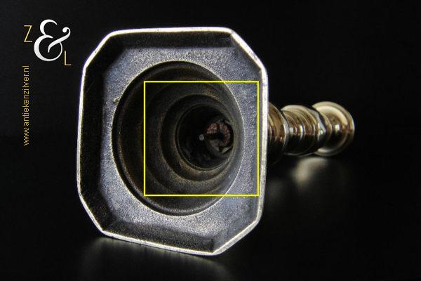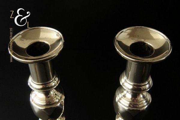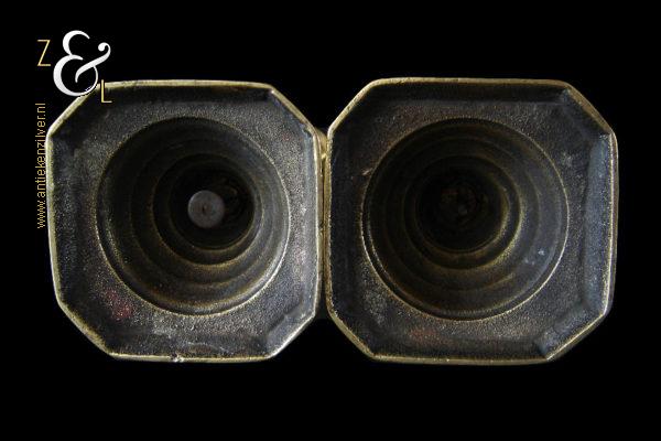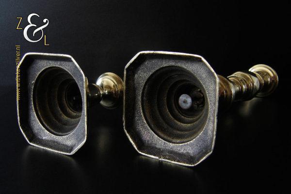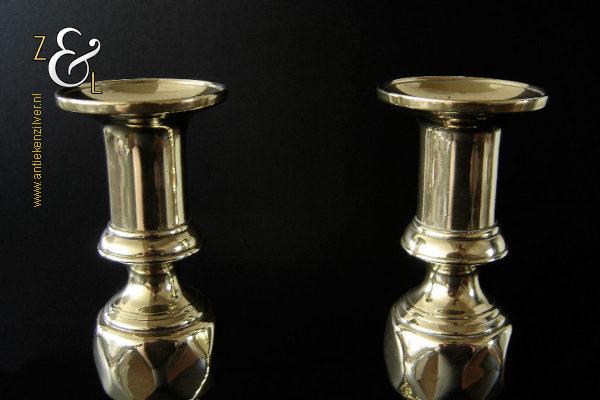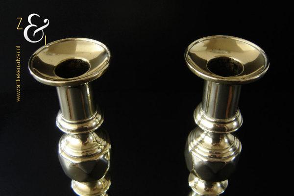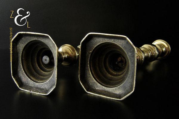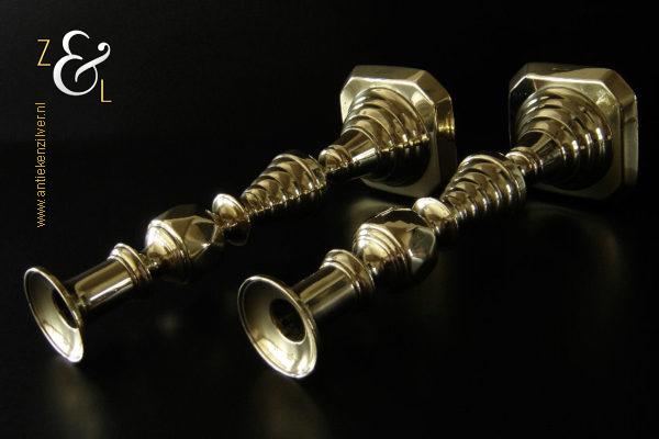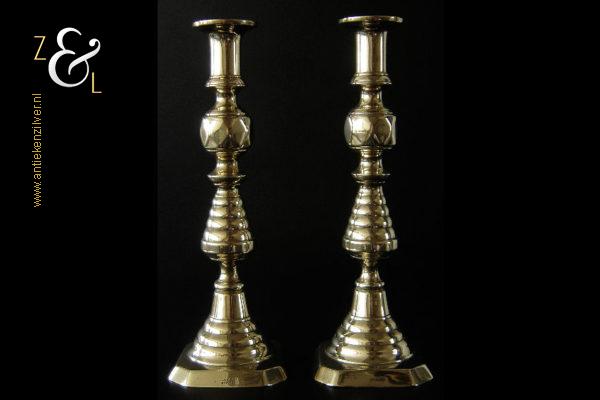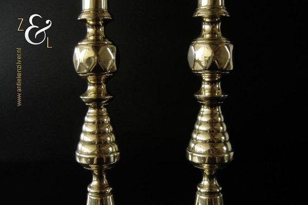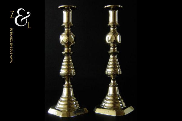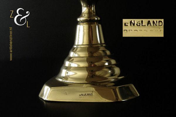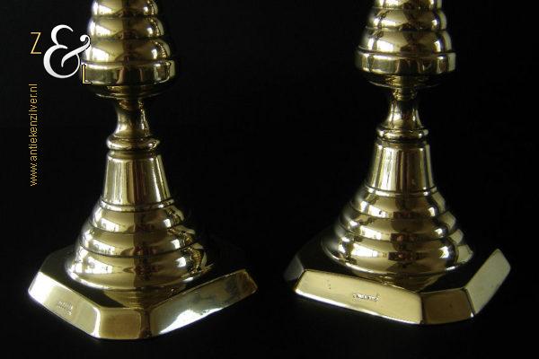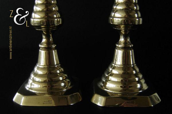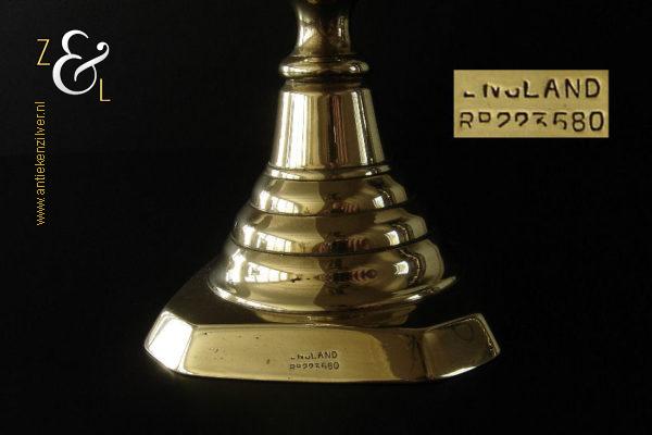 Dit stel messing kandelaars model “Bijenkorf & Diamant” is gemaakt in Engeland tijdens de tweede helft van de 19e eeuw de Victoriaanse periode die liep van 1837 tot 1901. De kandelaars waarvan de balustervormige stelen zijn uitgevoerd met een Bijenkorf en gefacetteerde knop “Diamant” zijn 30.1 cm hoog, hebben een vierkante voet met afgeschuinde hoeken van 10.5 cm bij 10.5 cm en wegen samen 1357 gram. De kandelaars zijn geschikt voor kaarsen met een diameter van 2.4 cm en hebben een bobèche (kaarsvetopvanger) met een diameter van 5.5 cm. De kandelaars zijn op de voet gestempeld met: England Rd 223580 dit is het geregistreerde Engelse ontwerpnummer uit 1894, bij één van de kandelaars is het nummer niet goed duidelijk afgestempeld ( alleen de bovenzijde van het nummer is leesbaar). Tevens zijn de kandelaars voorzien van een zogenaamd “Push up ejection mechanism” (duwuitwerp-mechanisme) een patent van James Barlow sinds 1839, hiermee kon men na het branden van een kaars op een gemakkelijke wijze het overgebleven kaarsvet of de kaarsstomp verwijderen. James Barlow Brass Candlestick Maker te Birmingham was een fabrikant van diverse messing en koperen gebruiksartikelen. Bij één van de kandelaars is het ronde duwschijfje van het “Push up ejection mechanism” (duwuitwerp-mechanisme) kwijtgeraakt zie geel omkaderd gedeelte op afbeelding.