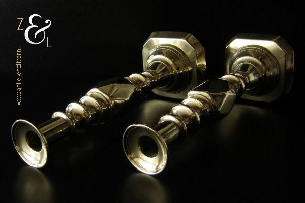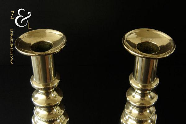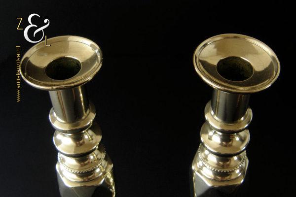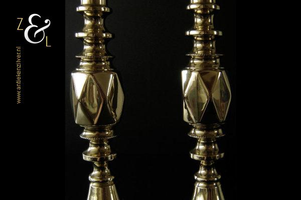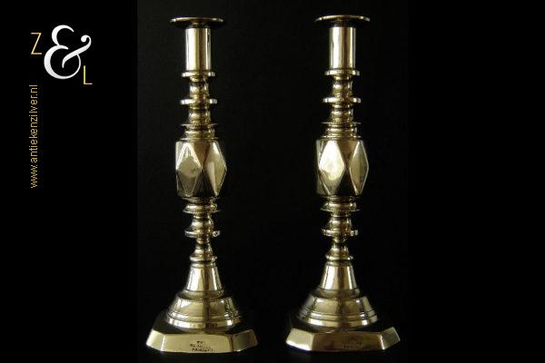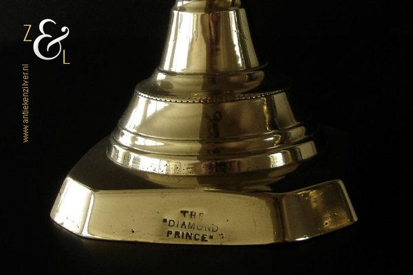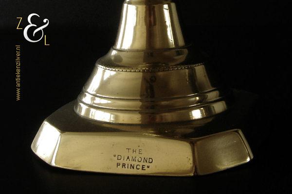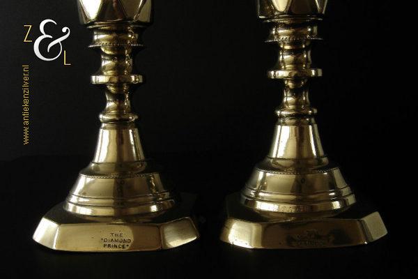 Dit stel messing kandelaars genaamd “The Diamond Prince” is gemaakt in de eerste helft van de 20e eeuw in Birmingham Engeland door James Clews and Sons. De kandelaars waarvan de balustervormige stelen zijn uitgevoerd met een gefacetteerde knop (Diamond) zijn 29.9 cm hoog, hebben een vierkante voet met afgeschuinde hoeken van 10.9 cm bij 10.9 cm en wegen samen 1577 gram. De kandelaars zijn geschikt voor kaarsen met een diameter van 2.3 cm en hebben een bobèche (kaarsvetopvanger) met een diameter van 5.4 cm. De kandelaars hebben lichte gebruikssporen (krasjes) en bij één kandelaar is de voet licht verbogen zie geel omkaderd gedeelte op afbeelding.