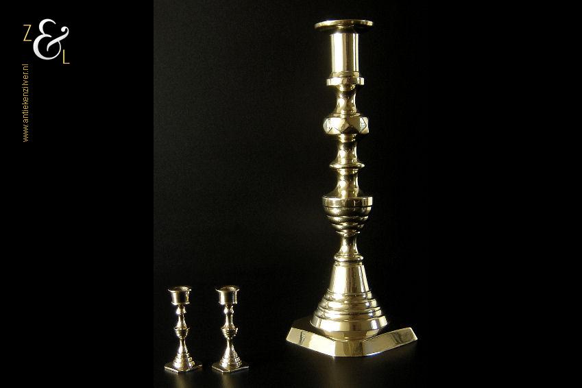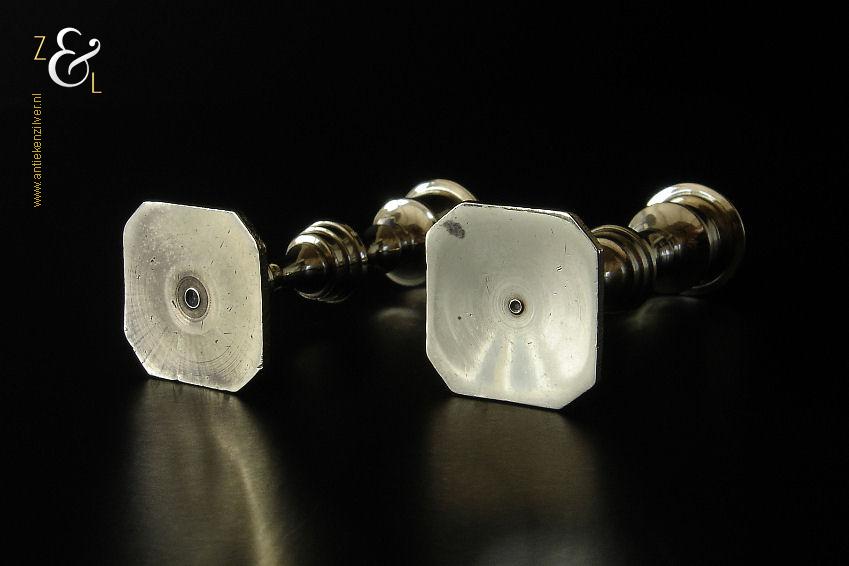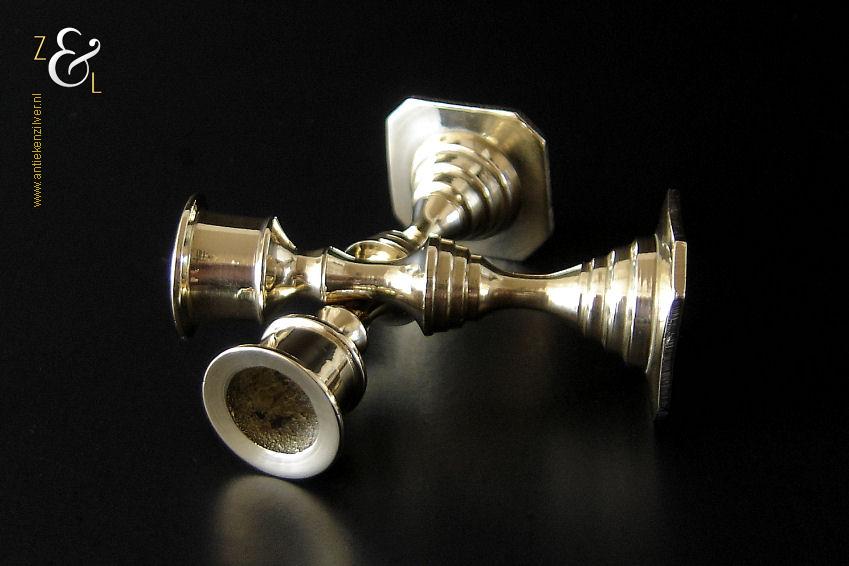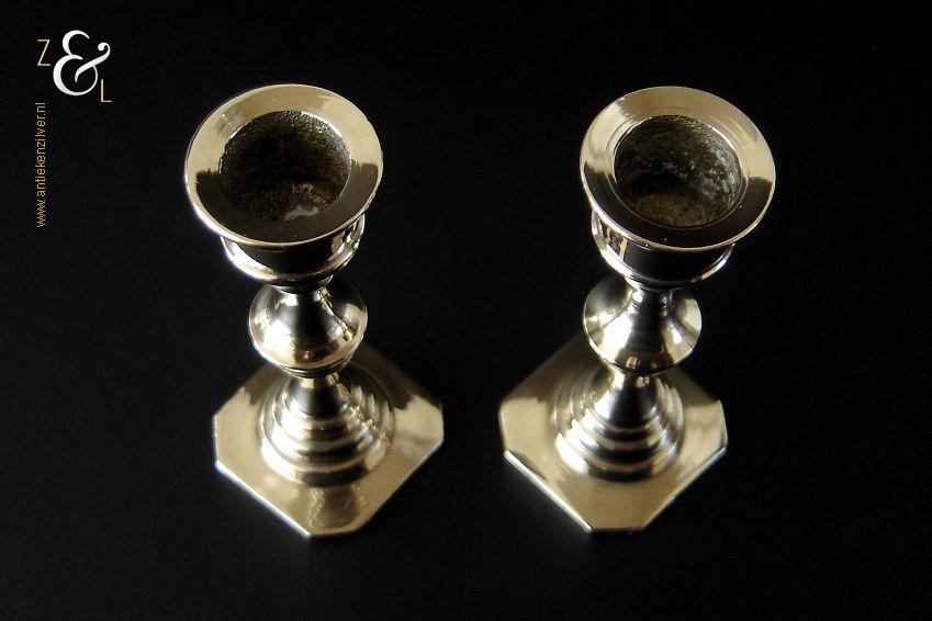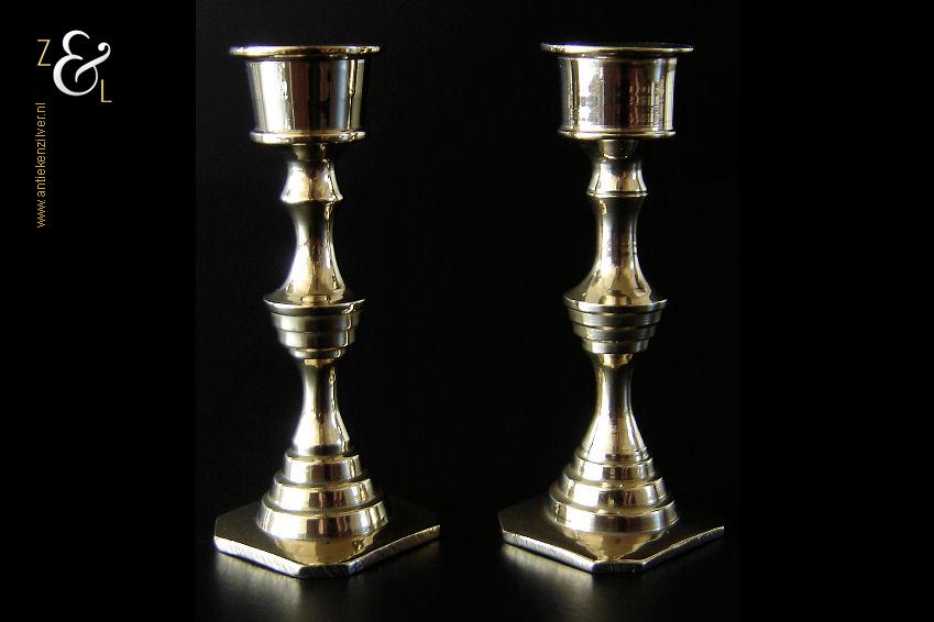 Dit stel messing miniatuur kandelaars is gemaakt in Engeland omstreeks de eerste helft van de 20e eeuw. De miniatuur kandelaars waarvan de balustervormige stelen zijn uitgevoerd met een omgekeerde bijenkorf zijn 6.4 cm hoog, hebben een vierkante voet met van 2.5 cm bij 2.5 cm en wegen samen 90 gram.