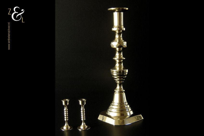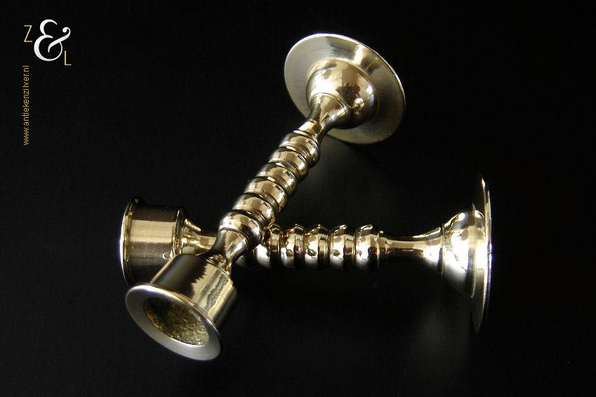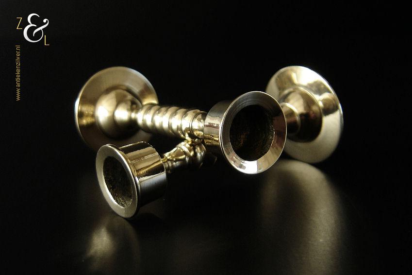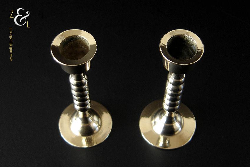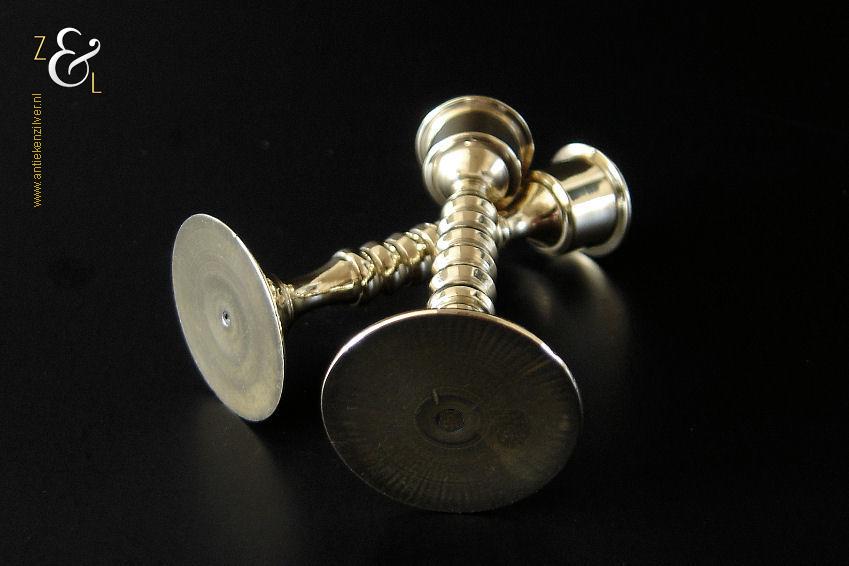 Dit stel messing miniatuur kandelaars is gemaakt in Engeland omstreeks de eerste helft van de 20e eeuw. De miniatuur kandelaars waarvan de stelen in model bobbin zijn uitgevoerd zijn 6.8 cm hoog, hebben een ronde voet met een diameter van 3 cm en wegen samen 82 gram.