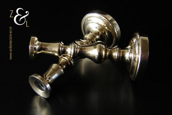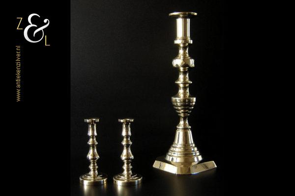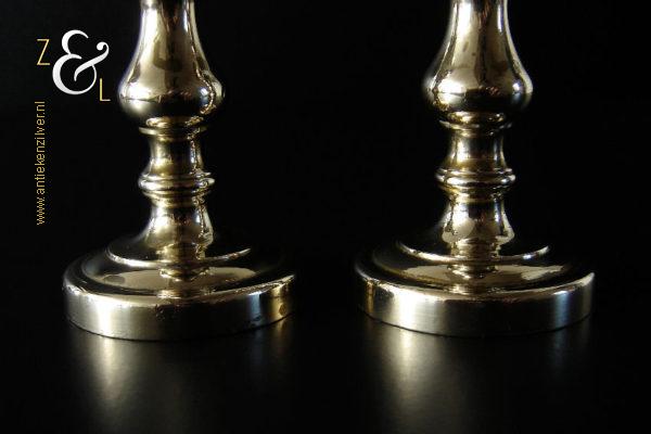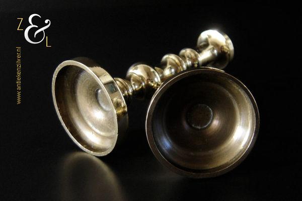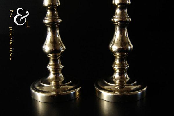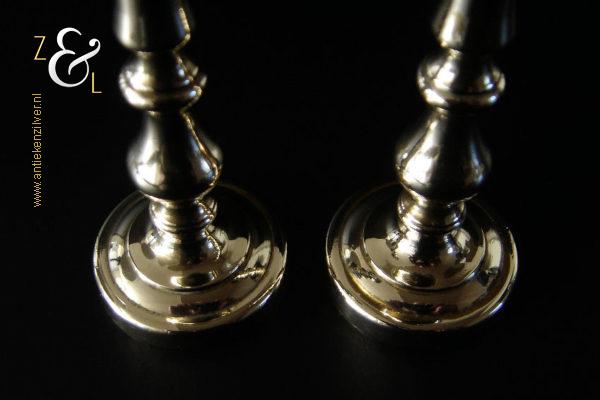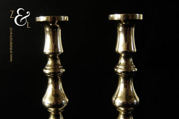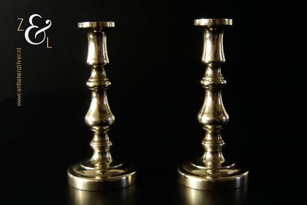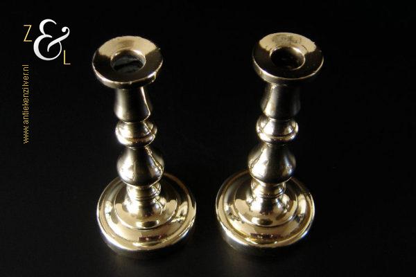 Dit stel massief gegoten messing miniatuur / speelgoed kandelaars is gemaakt in Nederland en stamt uit het eind van de 19e en het begin van de 20e eeuw. Het stel kandelaars met balustervormige steel is 10.3 cm hoog, heeft een ronde voet met een diameter van 4.7 cm en wegen samen 322 gram.