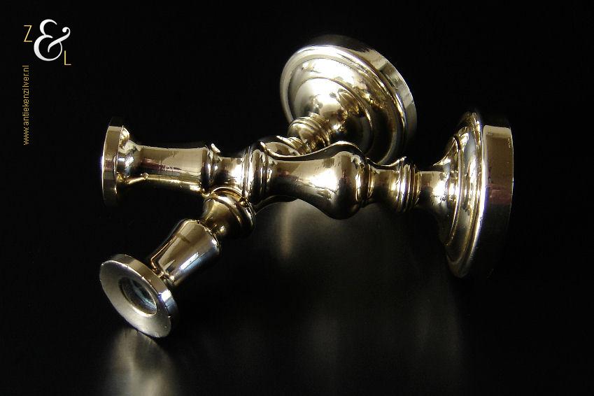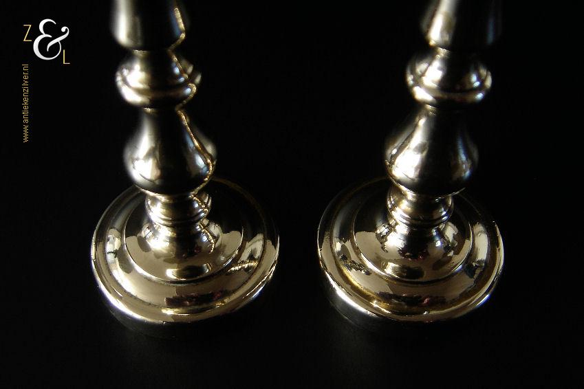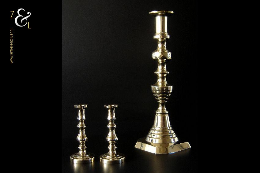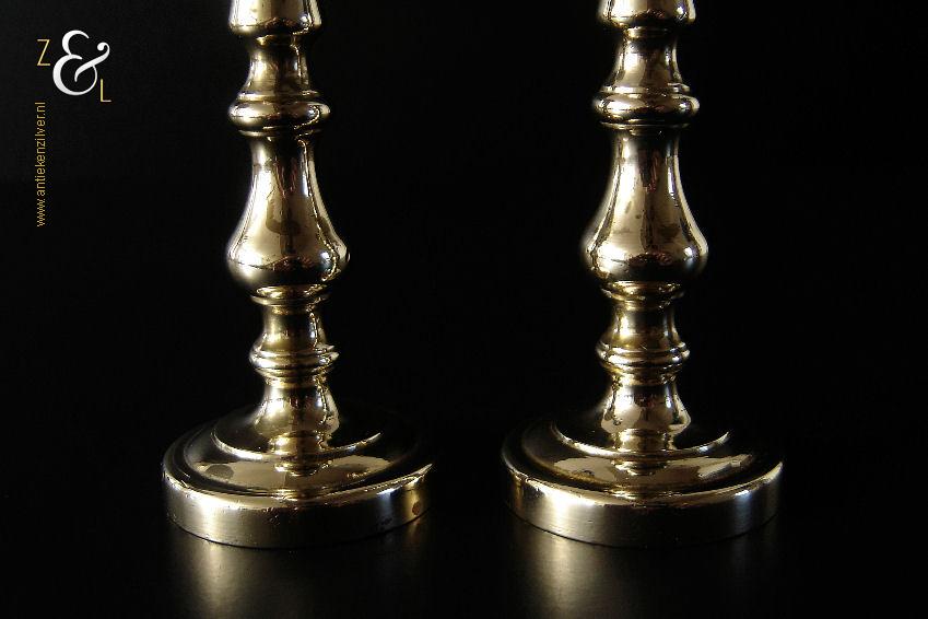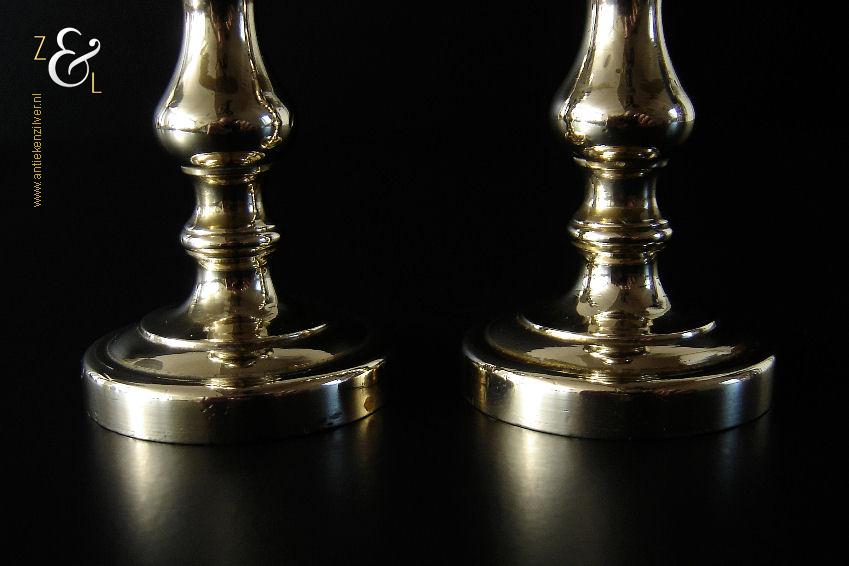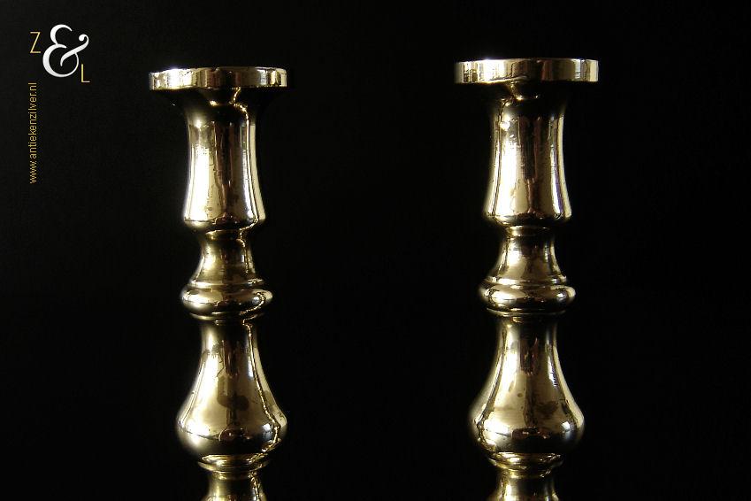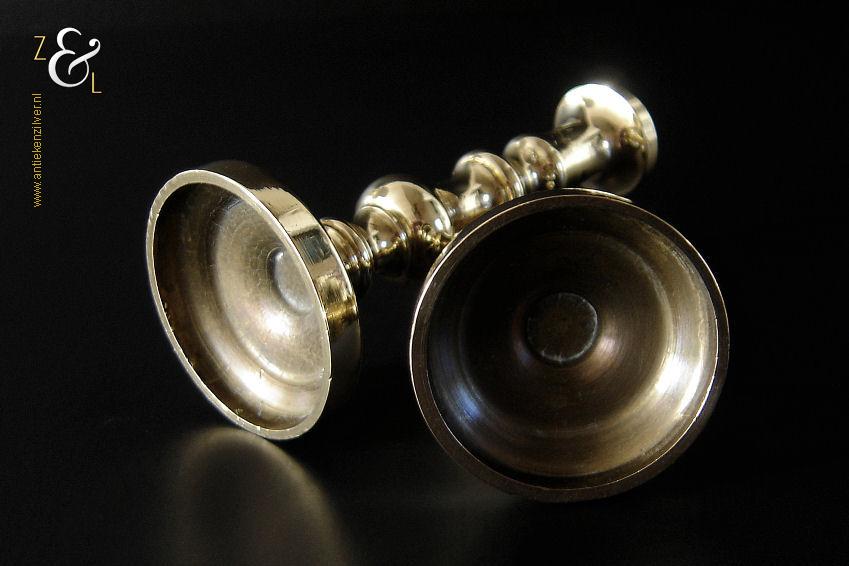 Dit stel massief gegoten messing miniatuur / speelgoed kandelaars is gemaakt in Nederland en stamt uit het eind van de 19e en het begin van de 20e eeuw. Het stel kandelaars met balustervormige steel is 10.3 cm hoog, heeft een ronde voet met een diameter van 4.7 cm en wegen samen 322 gram.