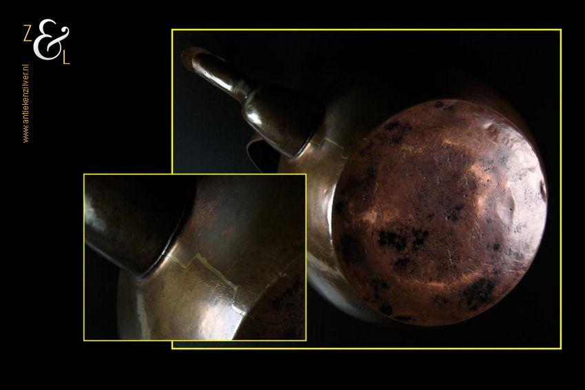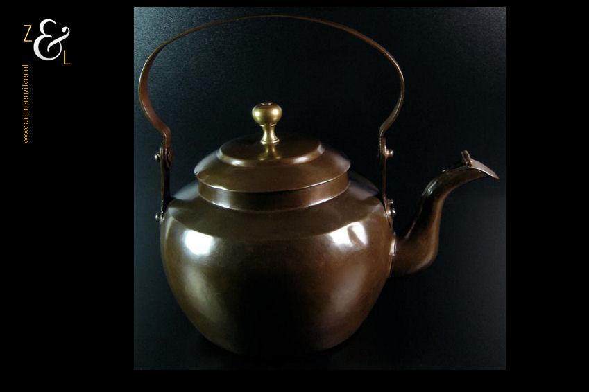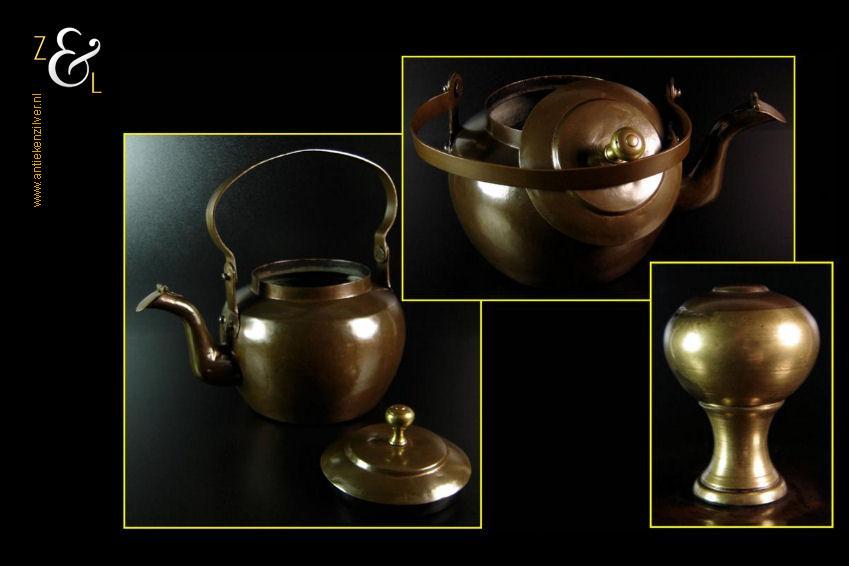 Deze Hollandse appelketel stamt uit de eerste helft van de negentiende eeuw. De ketel is gemaakt van koper heeft een messing knop en is van binnen vertind. De bodem en zijkant hebben een zwaluwstaart verbinding en het hengsel is met nagels vastgezet. De ketel heeft zijn nog oorspronkelijke donkerbruine patina weegt 1637 gram meet met het hengsel omhoog 30 cm, is 30.5 cm lang en 21 cm breed. De ketel heeft een klein deukje (is zichtbaar op de derde foto).