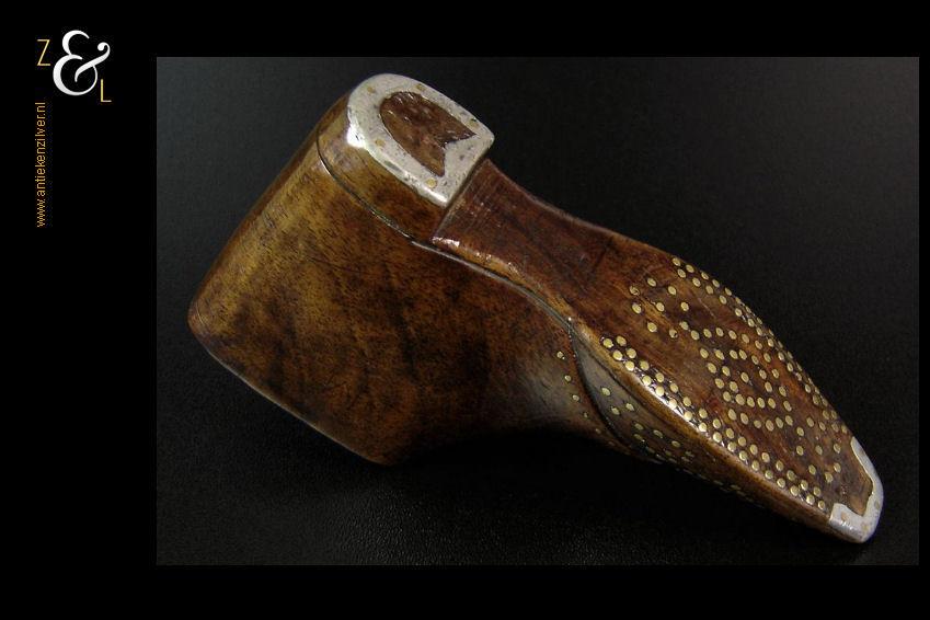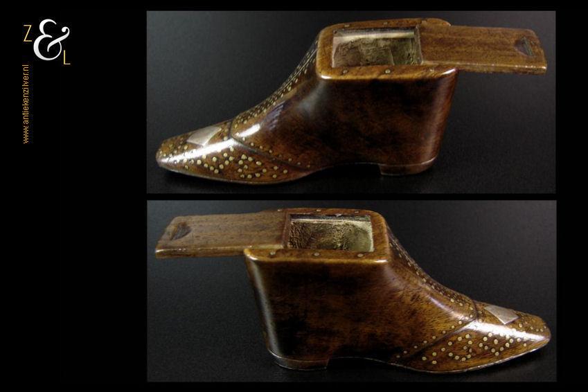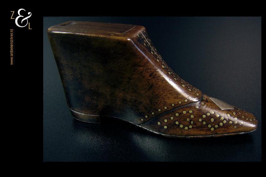 Deze houten snuifdoos in de vorm van een schoen is circa 1840 gemaakt in Engeland tijdens de vroeg Victoriaanse periode. De bijzonder mooi bewaard gebleven snuifdoos weegt 48 gram is 10.7 cm lang 3.5 cm breed en 5.4 cm hoog. De snuifdoos is gedecoreerd met koperen nageltjes van diverse maten en een zilveren pastille voor een monogram. Kleine houten voorwerpen worden in Engeland “treen” genoemd, deze snuifdoos valt ook hieronder.