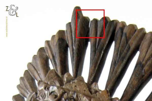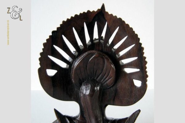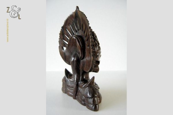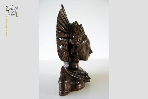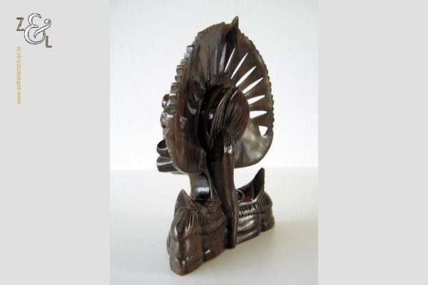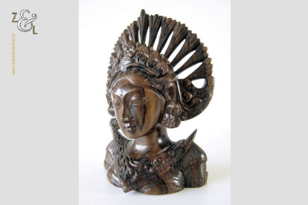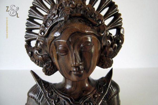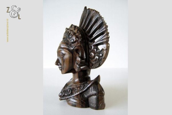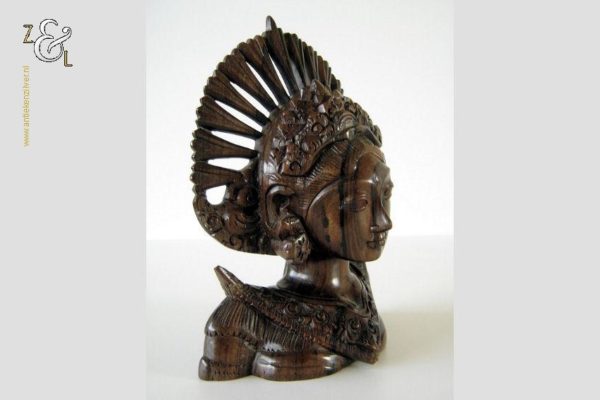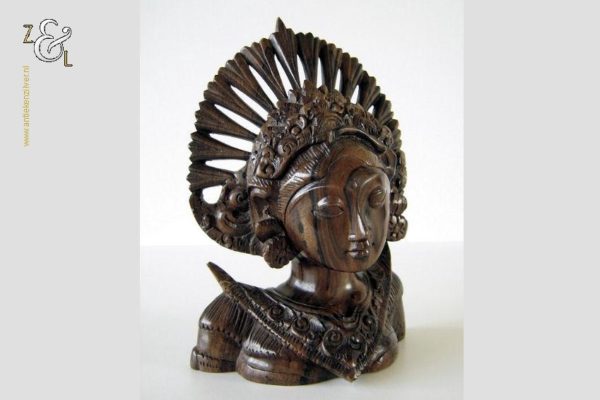 Dit hardhouten sculptuur / buste / borstbeeld is omstreeks de jaren vijftig gemaakt op het eiland Bali Indonesië. Het sculptuur heeft de voorstelling van een Djanger danseres in traditionele kleding. In de oren draagt ze grote subeng (oorsieraden) en op haar hoofd een hoofdtooi met aan de achterzijde daarvan gestileerd opgestoken haar met een paardenstaart. Het uit één stuk op de hand gesneden tropisch hardhouten sculptuur weegt 560 gram is 14.1 cm lang bij 8 cm breed en 20.2 cm hoog. Het sculptuur heeft een klein scheurtje in de hoofdtooi (zie rood omkaderd gedeelte op afbeelding).