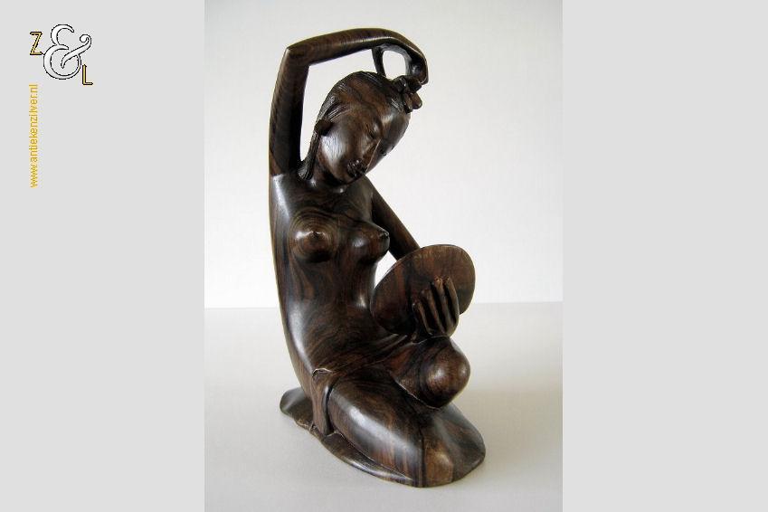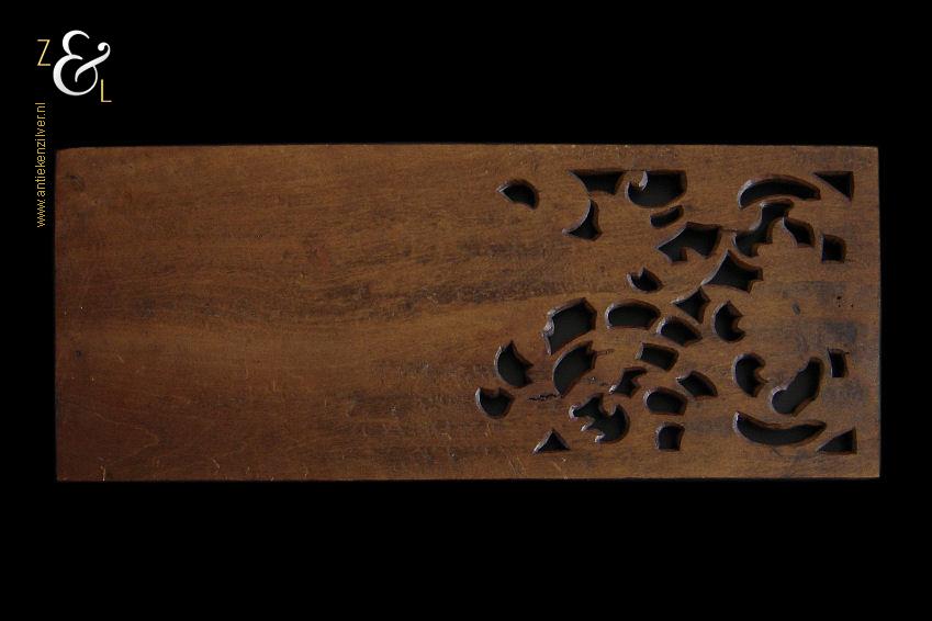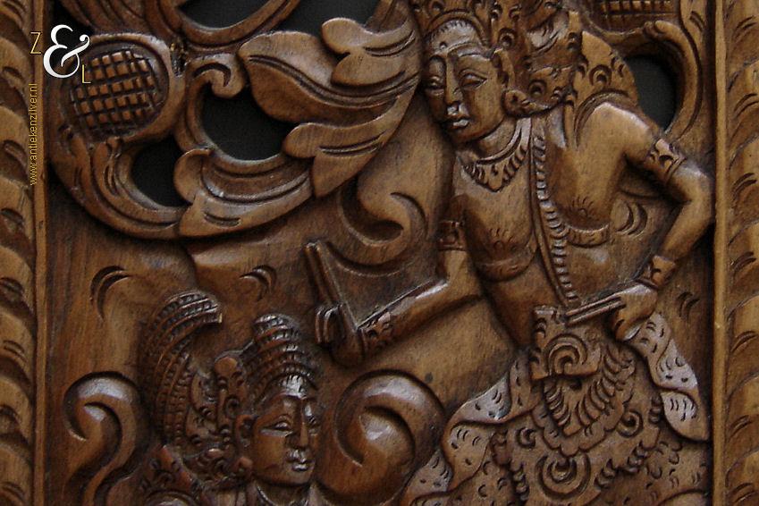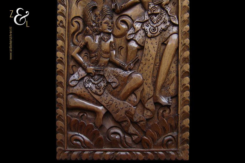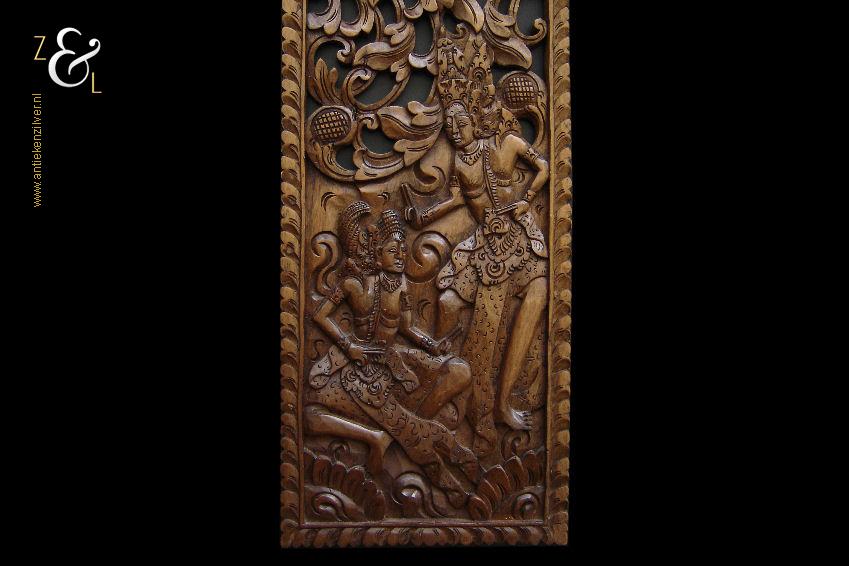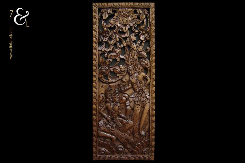 Dit op de hand ajour uitgestoken houten wandpaneel is omstreeks de jaren vijftig van de twintigste eeuw gemaakt op het eiland Bali – Indonesië. Het gedetailleerde houtsnijwerk waarop twee figuren zijn afgebeeld met rondom gestileerde bladeren en midden boven een lotusbloem weegt 427 gram is 48.2 cm lang bij 19 cm breed en 1.4 cm dik. Het wandpaneel is iets kromgetrokken.