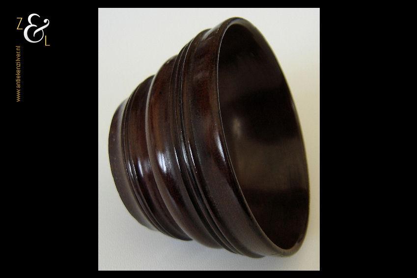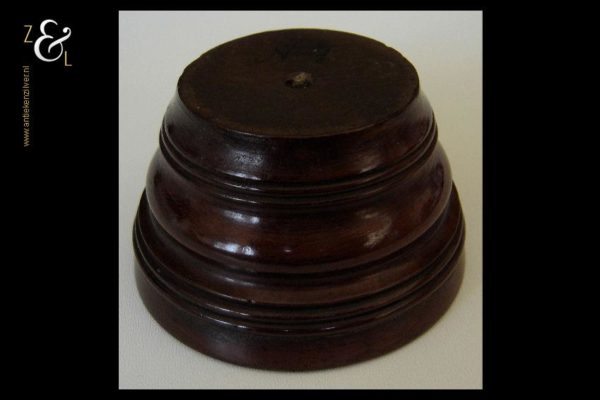 Dit houten kluwenbakje / knottenbakje is in het midden van de 19e eeuw gemaakt in Nederland en stamt uit de Biedermeier periode. Het kluwenbakje / knottenbakje weegt 52 gram heeft een diameter van 7.7 cm en is 4.5 cm hoog. De voet heeft een diameter van 4.8 cm.