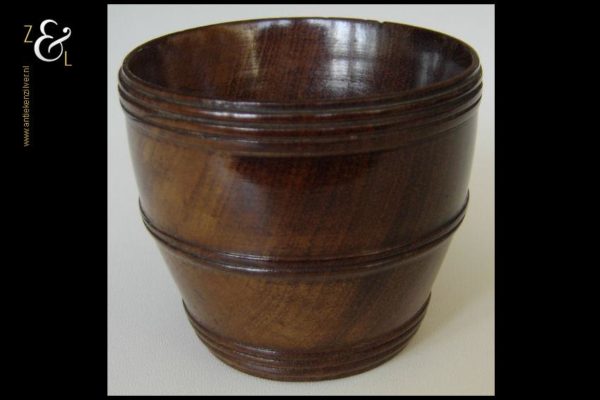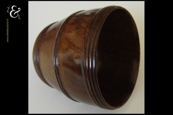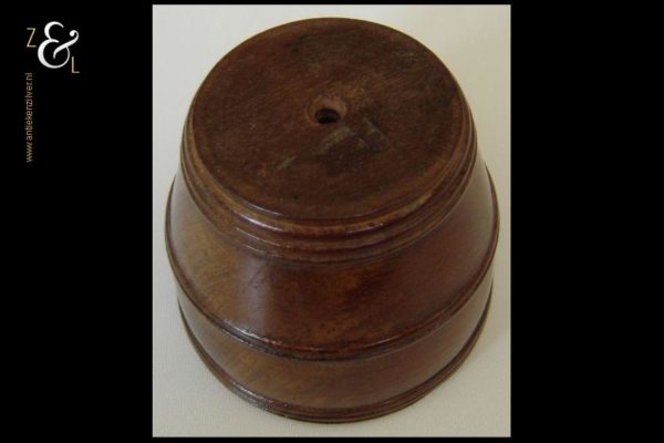 Dit houten kluwenbakje / knottenbakje is in het midden van de 19e eeuw gemaakt in Nederland en stamt uit de Biedermeier periode. Het kluwenbakje / knottenbakje weegt 90 gram heeft een diameter van 7.7 cm en is 6.5 cm hoog. De voet heeft een diameter van 5.3 cm.