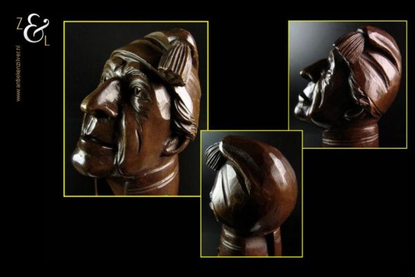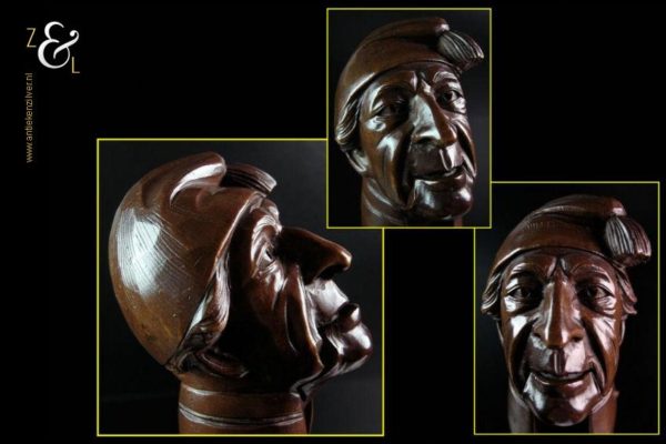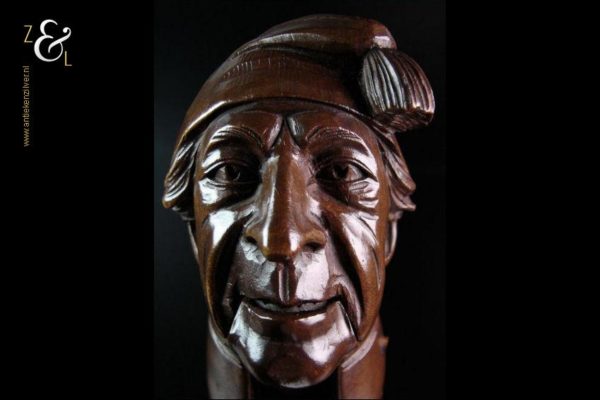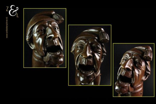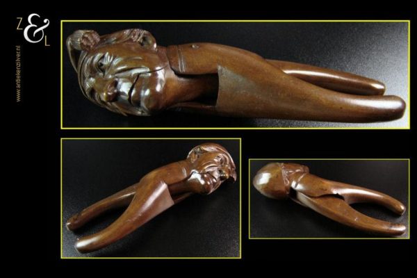 Deze prachtige notenkraker is omstreeks 1920 gemaakt in Brienz Zwitserland. Vroeger dacht men dat dit houtsnijwerk gemaakt werd in het Zwarte Woud (Zuidwest Duitsland) maar tegenwoordig weet men dat dit houtsnijwerk ontstaan is in Brienz Zwitserland bijvoorbeeld bij de Holzschnitzerei van Christian Fisher. Daar ging men als men in de winter ingesneeuwd raakte houtsnijwerk maken. Deze notenkraker die in Engeland is ingekocht, werd voor de toeristische markt geproduceerd. De Victoriaanse reizigers die rond 1900 in de vakantieoorden van Zwitserland verbleven kochten tijdens hun vakantie in de winkels aldaar houtsnijwerk als souvenir. Blijkbaar is deze antieke notenkraker op die manier in Engeland terecht gekomen. De zéér gedetailleerde notenkraker die de vorm heeft van een oude man met slaapmuts is prachtig scherp gesneden, hieraan herkent men het vakmanschap van de houtsnijder. De antieke (vruchten)houten notenkraker weegt 124 gram en is 19.7 cm lang.
